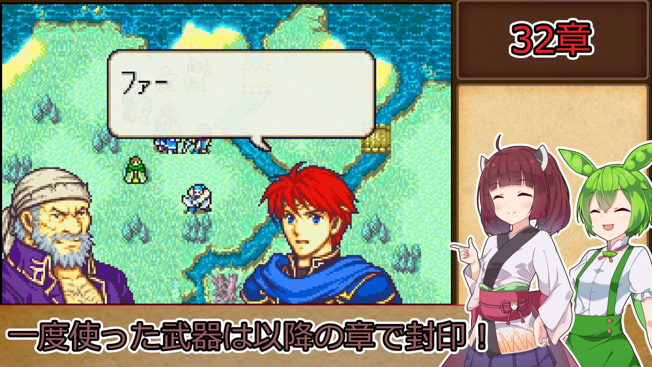 <span style="color: #85200c; font-size: 24px;"><strong><i>実はウォーリアをエースユニット枠にすることを<br>決定付けた章がここです</i></strong></span><br><br><strong>ルール1:一度使用した武器種は、以降の章で使用する事を禁止する。<br>ルール2:武器の使用の定義は『その武器を装備した状態で敵との戦闘が発生したタイミング』『その武器を売却して換金した場合』杖の場合は『対象に対して使用した時点(命中の可否は問わない)』とする。</strong><br><span style="color: #ff0000;"><strong>※同盟軍、演出による戦闘イベントでは使用した判定にはならないこととする。</strong></span><br><strong>ルール3:難易度はリン編ハード→ヘクトル編ハードとする。<br>ルール4:序章から終章まで外伝、異伝を含む全ての章を攻略し、仲間に出来るユニットは全員加入させ、生存させる。(序章と1章のみ同一の章として扱う)</strong><br><span style="color: #ff0000; font-size: 18px;"><strong>※バグ技禁止</strong></span><br><br>本動画のシリーズリスト【<a href="https://www.nicovideo.jp/series/406473" target="_blank" rel="noopener">series/406473</a>】<br>前作の同縛りプレイ【<a href="https://www.nicovideo.jp/series/316824" target="_blank" rel="noopener">series/316824</a>】<br>前:【<a href="https://www.nicovideo.jp/watch/sm43601087" class="watch">sm43601087</a>】次:【<a href="https://www.nicovideo.jp/watch/sm43658861" class="watch">sm43658861</a>】<br><br><strong>使用したソフト</strong><br>VOICEROID+東北きりたんEX<br>VOICEPEAK ずんだもん<br><strong>お借りした素材</strong><br>ニコニコモンズの皆様(コンテンツツリー参照)
