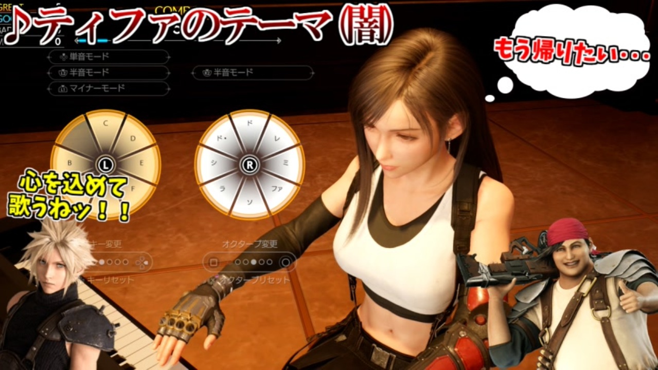 収益化弾かれて本編に入れられなかった2シーンの供養<br><br>1:47 ~ ティファのテーマ(闇)演奏開始<br>8:56 ~ ティファの腹筋ミニゲーム開始<br><br>前回(♪旅の途中で(闇))→<a href="https://www.nicovideo.jp/watch/sm43527296" class="watch">sm43527296</a><br><br>本編パート1→<a href="https://www.nicovideo.jp/watch/sm43467685" class="watch">sm43467685</a> <br><br><br>FF7リメイク(前作)実況パート1→<a href="https://www.nicovideo.jp/watch/sm36771192" class="watch">sm36771192</a><br>ユフィ編(DLC)パート1→<a href="https://www.nicovideo.jp/watch/sm38865508" class="watch">sm38865508</a><br><br>【FF7Rマイリス】<a href="https://www.nicovideo.jp/mylist/68243189" target="_blank" rel="noopener">mylist/68243189</a><br>【チャンネル】<a href="https://ch.nicovideo.jp/ainosensi" target="_blank" rel="noopener">ch.nicovideo.jp/ainosensi</a><br>【その他投稿作品】<a href="https://www.nicovideo.jp/mylist/34427287" target="_blank" rel="noopener">mylist/34427287</a> 【Twitter】@ainosensi2<br>【YOUTUBE】<a href="http://goo.gl/OMphlA" target="_blank" rel="noopener nofollow">http://goo.gl/OMphlA</a>