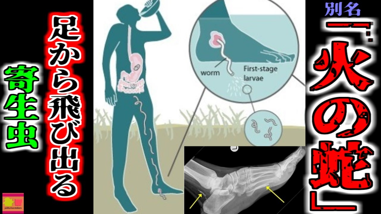 <a href="#" class="seekTime" data-seekTime="00:00" onclick="seekNicoPlayer('#00:00'); return false;">#00:00</a> OP<br><a href="#" class="seekTime" data-seekTime="00:13" onclick="seekNicoPlayer('#00:13'); return false;">#00:13</a> 足に違和感を覚えた「Aさん」<br><a href="#" class="seekTime" data-seekTime="00:55" onclick="seekNicoPlayer('#00:55'); return false;">#00:55</a> 整形外科で撮影したレントゲンには…<br><a href="#" class="seekTime" data-seekTime="1:30" onclick="seekNicoPlayer('#1:30'); return false;">#1:30</a> 視聴上の注意<br><a href="#" class="seekTime" data-seekTime="2:04" onclick="seekNicoPlayer('#2:04'); return false;">#2:04</a> 専門医の診断<br><a href="#" class="seekTime" data-seekTime="2:37" onclick="seekNicoPlayer('#2:37'); return false;">#2:37</a> 「ギニアワーム」<br><a href="#" class="seekTime" data-seekTime="4:14" onclick="seekNicoPlayer('#4:14'); return false;">#4:14</a> 運よく助かったAさん<br><a href="#" class="seekTime" data-seekTime="5:09" onclick="seekNicoPlayer('#5:09'); return false;">#5:09</a> 何故こんなことに?感染の背景<br><a href="#" class="seekTime" data-seekTime="5:33" onclick="seekNicoPlayer('#5:33'); return false;">#5:33</a> スーダン特有の事情<br><a href="#" class="seekTime" data-seekTime="7:43" onclick="seekNicoPlayer('#7:43'); return false;">#7:43</a> 徐々に少なくはなっているが・・・<br><br>今回紹介するのは、オーストラリアで発生した珍しい感染症の事例です。<br>オーストラリアに暮らす30代の男性「Aさん」は、少し前から足に違和感を覚えており、それがずっと気がかりになっていました。<br>そこでこの日、整形外科を受診して足を調べてもらったAさん。<br>すると彼のレントゲン写真には、「細い針」のようなものが2本映り込んでおり、「もしや・・・」と思った医師は、知り合いの感染症専門家に連絡し、別の医院への紹介状を書きました。<br>そしてそこで改めて検査を受けたAさんは、医師から「ギニアワーム症」と診断されました。<br>これは水辺に生息している寄生虫の一種で、ミジンコに寄生した幼虫を飲み水などからヒトが摂取することで感染します。<br>するとその幼虫は体内で栄養を吸収して成長し、消化器官の壁に小さな穴を空け、筋肉などを喰い進んで、最終的に足を目指します。<br>足に到着したギニアワームは、そこで組織を食い荒らし、宿主は水疱の症状、尺熱感などを覚えるようになります。<br>すると宿主は、足を冷やすために水に足を突っ込みたくなり、皮膚が足に触れて局所的に冷やされると、ギニアワームが温度差を感じ、皮膚にできた水疱から外へと飛び出してきます、<br>そして水に触れると同時に、大量に幼虫を産卵し、それがミジンコに寄生して・・・<br><br><br>引用・出展・参考文献<br>MSDマニュアル 「メジナ虫症」<br><a href="https://ishort.ink/Ttmq" target="_blank" rel="noopener nofollow">https://ishort.ink/Ttmq</a><br>エーザー㈱ メジナ虫症 「ギニア虫症」<br><a href="https://ishort.ink/MM3B" target="_blank" rel="noopener nofollow">https://ishort.ink/MM3B</a><br>CNN 「火の蛇」狩り、ギニアワーム撲滅への取り組み<br><a href="https://ishort.ink/ad9C" target="_blank" rel="noopener nofollow">https://ishort.ink/ad9C</a><br><br><br><br><br><br />※この動画は過去の事件を知り、現在でも同じことが発生する危険性を再認識、関与しないように促すための動画であり、視聴者を扇動、動揺を誘うためのコンテンツではありません。<br><br>ご要望にお応えして、メンバーシップの開設を行いました。<br>下記URLからも登録可能ですので、ご興味がある方は是非ご参加ください。<br><a href="https://www.youtube.com/channel/UCcT5a1J7XJW7CLYI2RKl4pw/join" target="_blank" rel="noopener nofollow">https://www.youtube.com/channel/UCcT5a1J7XJW7CLYI2RKl4pw/join</a><br><br><br>Twitter<br>→<a href="https://twitter.com/yukkurisurutoko" target="_blank" rel="noopener nofollow">https://twitter.com/yukkurisurutoko</a><br><br>取り急ぎ、簡易的にですがマイリストを作りました。<br>【ゆっくり解説】事故・事件関係紹介リスト <br><a href="https://www.nicovideo.jp/mylist/71034319" target="_blank" rel="noopener nofollow">https://www.nicovideo.jp/mylist/71034319</a><br>【ゆっくり解説】放射線系事故<br><a href="https://www.nicovideo.jp/mylist/71034368" target="_blank" rel="noopener nofollow">https://www.nicovideo.jp/mylist/71034368</a><br>【ゆっくり解説】鉄道系事故・事件関連<br><a href="https://www.nicovideo.jp/mylist/71034379" target="_blank" rel="noopener nofollow">https://www.nicovideo.jp/mylist/71034379</a>