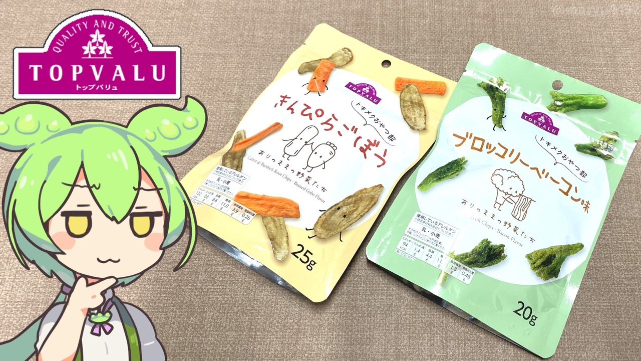 以前に紹介した「トキメクおやつ部シリーズ」から<br>今回は野菜スナックを紹介します。<br><br><br>【関連動画】<br>トップバリュの赤いヤツ「がんばる戦士グミと癒しの魔導士グミ」<br><a href="https://www.nicovideo.jp/watch/sm43593723" target="_blank" rel="noopener nofollow">https://www.nicovideo.jp/watch/sm43593723</a><br><br>【参考】<br>トキメクおやつ部 ありのままの野菜たち きんぴらごぼう(トップバリュ)<br><a href="https://www.topvalu.net/items/detail/4549414620405/" target="_blank" rel="noopener nofollow">https://www.topvalu.net/items/detail/4549414620405/</a><br>トキメクおやつ部 ありのままの野菜たち ブロッコリーベーコン味(トップバリュ)<br>「トップバリュ トキメクおやつ部シリーズ」新発売 2024.2.28(トップバリュ)<br><a href="https://www.aeon.info/news/release_83903/" target="_blank" rel="noopener nofollow">https://www.aeon.info/news/release_83903/</a><br>株式会社マルエス<br><a href="https://www.maruesu-web.co.jp/" target="_blank" rel="noopener nofollow">https://www.maruesu-web.co.jp/</a><br>うちの郷土料理 きんぴら 東京都(農林水産省)<br><a href="https://www.maff.go.jp/j/keikaku/syokubunka/k_ryouri/search_menu/menu/34_27_tokyo.html" target="_blank" rel="noopener nofollow">https://www.maff.go.jp/j/keikaku/syokubunka/k_ryouri/search_menu/menu/34_27_tokyo.html</a><br><br>【使用した素材】(※敬称略)<br>(合成音声)VOICEVOX/ずんだもん/四国めたん<br><a href="https://voicevox.hiroshiba.jp/" target="_blank" rel="noopener nofollow">https://voicevox.hiroshiba.jp/</a><br>(立ち絵)坂本アヒル<br><a href="https://seiga.nicovideo.jp/seiga/im10788496" target="_blank" rel="noopener">im10788496</a>/<a href="https://seiga.nicovideo.jp/seiga/im10791276" target="_blank" rel="noopener">im10791276</a><br>(楽曲)甘茶の音楽工房/「楽しい麦畑」「フルーツパフェ」「お城の舞踏会」<br><a href="https://amachamusic.chagasi.com/" target="_blank" rel="noopener nofollow">https://amachamusic.chagasi.com/</a>
