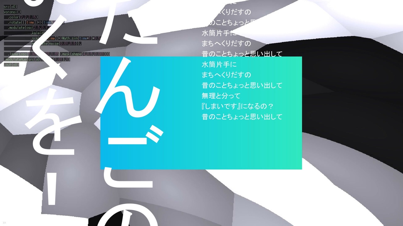 微円です<br>カゼヒキβくんに歌ってもらった最後の曲になりました<br><br>vocal:カゼヒキβ, 重音テトSV<br><br>他:微円<br><a href="https://twitter.com/hana_kosho_chu" target="_blank" rel="noopener nofollow">https://twitter.com/hana_kosho_chu</a><br><br>Synthesizer V AI 重音テト ライト版を使用しています<br><br>【歌詞】<br>水筒片手に まちへくりだすの<br>昔のこと ちょっと思い出しながらさ<br><br>すれ違う肩で ごつんとしたら<br>明日また 会えるんだっけ<br>胸に空いた気がします ぽっかり<br>ないからだ 破竹の勢い<br><br>できればなにもふまずなにもつまずここからさりたい<br><br>むりか<br><br>水筒片手に まちへくりだすの<br>昔のこと ちょっと思い出しながらさ<br><br>無理と分って 『しまいです』になるの?<br>昔のことちょっと思い出して どろだんごのきおくを!<br /><br><br><br><br>mylist:<a href="https://www.nicovideo.jp/mylist/75453093" target="_blank" rel="noopener nofollow">https://www.nicovideo.jp/mylist/75453093</a><br><br><a target="_blank" href="https://qa.nicovideo.jp/faq/show/19424?site_domain=default" style="font-size: 13px;color: #657586; text-decoration: underline; line-height: 1.4">この動画は投稿者によって修正されました</a>