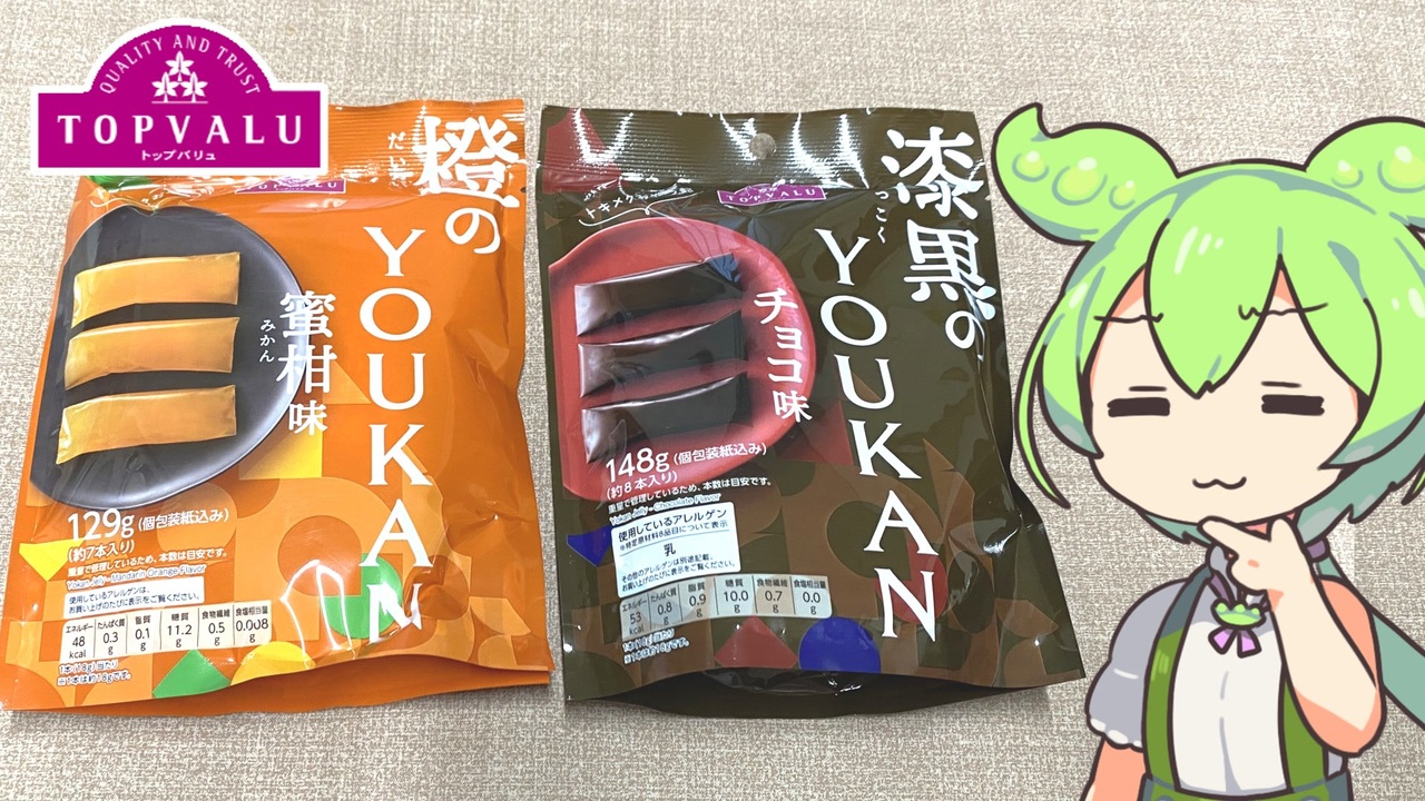 トキメクおやつ部シリーズからみかん味とチョコ味のようかんが登場。<br>あんこにチョコを入れるとどんな味になるのでしょうか。<br><br><br>【関連動画】<br>トップバリュの黄色いヤツ「おばあちゃんちにありそうなお菓子詰め合わせ」<br><a href="https://www.nicovideo.jp/watch/sm42725557" target="_blank" rel="noopener nofollow">https://www.nicovideo.jp/watch/sm42725557</a><br>トップバリュの赤いヤツ「野菜スナック(きんぴらごぼう・ブロッコリーベーコン味)」<br><a href="https://www.nicovideo.jp/watch/sm43636244" target="_blank" rel="noopener nofollow">https://www.nicovideo.jp/watch/sm43636244</a><br>トップバリュの赤いヤツ「がんばる戦士グミと癒しの魔導士グミ」<br><a href="https://www.nicovideo.jp/watch/sm43593723" target="_blank" rel="noopener nofollow">https://www.nicovideo.jp/watch/sm43593723</a><br><br>【参考】<br>トキメクおやつ部 橙のYOUKAN 蜜柑味(トップバリュ)<br><a href="https://www.topvalu.net/items/detail/4549414620498/" target="_blank" rel="noopener nofollow">https://www.topvalu.net/items/detail/4549414620498/</a><br>トキメクおやつ部 漆黒のYOUKAN チョコ味(トップバリュ)<br><a href="https://www.topvalu.net/items/detail/4549414620481/" target="_blank" rel="noopener nofollow">https://www.topvalu.net/items/detail/4549414620481/</a><br>10種のいろいろ和洋菓子(トップバリュ)<br><a href="https://www.topvalu.net/items/detail/4549414363036/" target="_blank" rel="noopener nofollow">https://www.topvalu.net/items/detail/4549414363036/</a><br>えいようかん(井村屋)<br><a href="https://www.imuraya.co.jp/goods/yokan/c-eiyo/eiyo/" target="_blank" rel="noopener nofollow">https://www.imuraya.co.jp/goods/yokan/c-eiyo/eiyo/</a><br>非常食に羊かんはいかがですか?(警視庁)<br><a href="https://www.keishicho.metro.tokyo.lg.jp/kurashi/saigai/yakudachi/food/dessert/1158171983772700672.html" target="_blank" rel="noopener nofollow">https://www.keishicho.metro.tokyo.lg.jp/kurashi/saigai/yakudachi/food/dessert/1158171983772700672.html</a><br><br>【使用した素材】(※敬称略)<br>(合成音声)VOICEVOX/ずんだもん/四国めたん<br><a href="https://voicevox.hiroshiba.jp/" target="_blank" rel="noopener nofollow">https://voicevox.hiroshiba.jp/</a><br>(立ち絵)坂本アヒル<br><a href="https://seiga.nicovideo.jp/seiga/im10788496" target="_blank" rel="noopener">im10788496</a>/<a href="https://seiga.nicovideo.jp/seiga/im10791276" target="_blank" rel="noopener">im10791276</a><br>(楽曲)甘茶の音楽工房/「楽しい麦畑」「フルーツパフェ」「お城の舞踏会」<br><a href="https://amachamusic.chagasi.com/" target="_blank" rel="noopener nofollow">https://amachamusic.chagasi.com/</a>