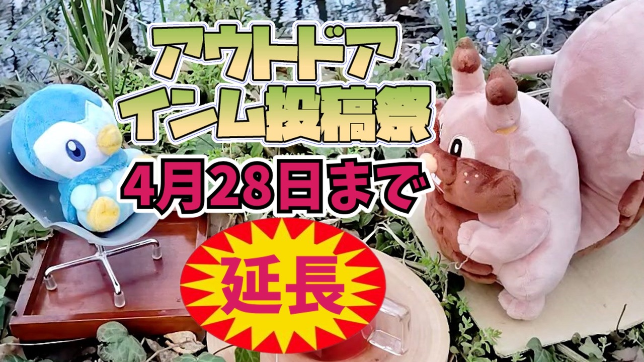 まだまだ参加お待ちしてナス!<br><br>《アウトドアインム投稿者祭開催中!》<br>【参加においてのルール(4月12日時点)】<br>・外で活動している動画なら大抵OK<br>・4月8日から4月28日の3週間の間に<br> 動画を各々で投稿してもらう(延長しました!)<br>・動画のタグに「アウトドアインム投稿祭」<br> をタグロックして入れる<br>・動画素材に淫夢素材を使用すること(BB素材・音声等)<br>・淫夢素材を使用できない場合、代わりに動画内のテキストに<br> 36個くらい淫夢語録を挿入すれば参加条件を満たしている物とする<br>・イキすぎた迷惑行為は申し訳ないがNG<br>・特定の投稿者を貶す動画は極力NG<br>・クッキー☆素材を使用してもヨシ!合成音声もVRCも114!514!<br> (ク☆単体の動画の場合は淫夢語録36個使用しても<br> しなくてもどっちでもいいです)<br><br>【▼エックス】<br><a href="https://twitter.com/Yaguruma84893" target="_blank" rel="noopener nofollow">https://twitter.com/Yaguruma84893</a><br>【▼前のトレハン部】<br><a href="https://www.nicovideo.jp/watch/sm43646699" class="watch">sm43646699</a><br>