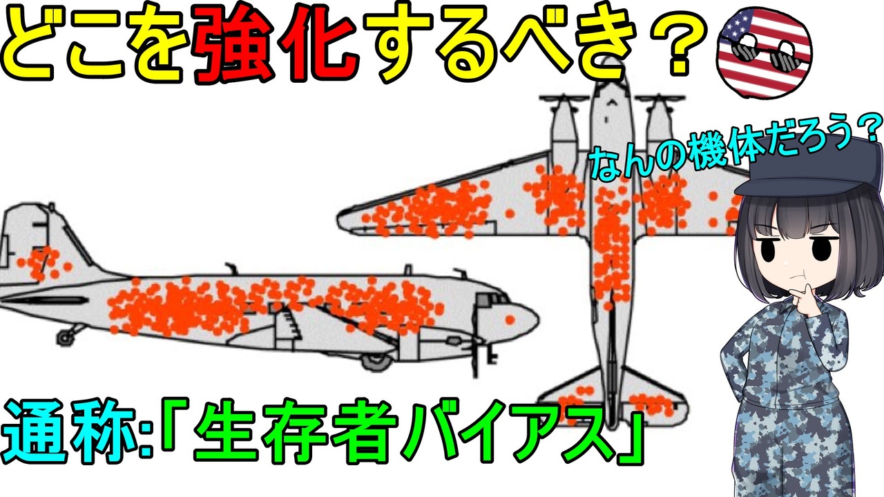 こういう問題が出てきたときは機種名まで当てれるようにしましょう!<br>引用・参考資料等<br>発端の記事<a href="https://www.motherjones.com/kevin-dru..." target="_blank" rel="noopener nofollow">https://www.motherjones.com/kevin-dru...</a><br>論文<a href="https://www.researchgate.net/publication/254286514_Abraham_Wald" target="_blank" rel="noopener nofollow">https://www.researchgate.net/publication/254286514_Abraham_Wald</a>'s_Work_on_Aircraft_Survivability<br>画像製作者の投稿<br><a href="https://twitter.com/cameronmoll/status/1317661364631097345" target="_blank" rel="noopener nofollow">https://twitter.com/cameronmoll/status/1317661364631097345</a><br />youtubeの方<br><a href="https://www.youtube.com/c/AdmiralyukkurimilitarybyRetoRooRaa/videos" target="_blank" rel="noopener nofollow">https://www.youtube.com/c/AdmiralyukkurimilitarybyRetoRooRaa/videos</a><br>ボクのツイッター<br><a href="https://twitter.com/retoro_V" target="_blank" rel="noopener nofollow">https://twitter.com/retoro_V</a><br>キャラデザイン<br>CaraCorn様