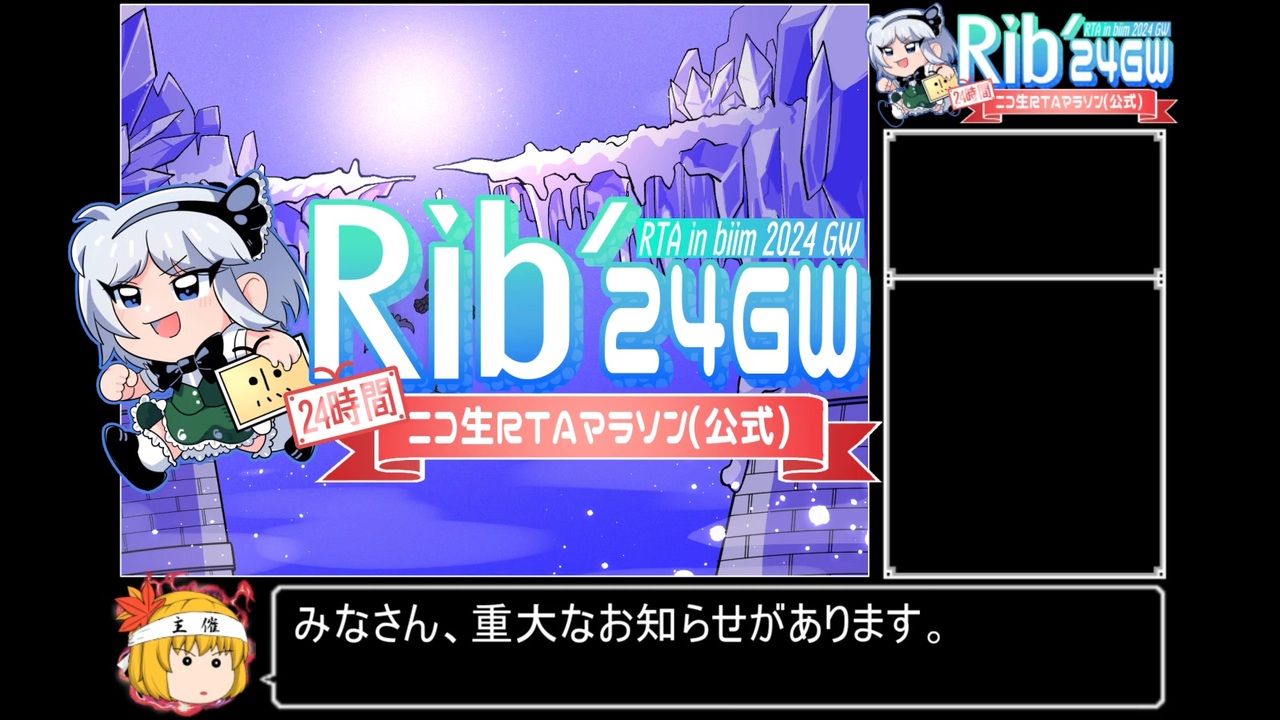5/3(金)12:00~5/6(月)14:00オールナイト開催!!<br>5/2(木)07:30からは昨年大会の再放送&決起集会<br><br>■0日目アーカイブ再放送 <br><a href="https://live.nicovideo.jp/watch/lv345033509" target="_blank" rel="noopener nofollow">https://live.nicovideo.jp/watch/lv345033509</a> <br><br>■決起集会&1日目URL <br><a href="https://live.nicovideo.jp/watch/lv345033539" target="_blank" rel="noopener nofollow">https://live.nicovideo.jp/watch/lv345033539</a><br><br>■1日目メガテンゾーン<br><a href="https://live.nicovideo.jp/watch/lv345043175" target="_blank" rel="noopener nofollow">https://live.nicovideo.jp/watch/lv345043175</a><br><br>■スケジュール<br><a href="https://horaro.org/rtainbiim/2024-gw" target="_blank" rel="noopener nofollow">https://horaro.org/rtainbiim/2024-gw</a><br><br>■スタッフ募集<br><a href="https://docs.google.com/forms/d/1L_GOhPlZz_pD_Qt3eBH5lMJN6LIN0mCugzN57264H_I/edit" target="_blank" rel="noopener nofollow">https://docs.google.com/forms/d/1L_GOhPlZz_pD_Qt3eBH5lMJN6LIN0mCugzN57264H_I/edit</a><br><br>■公式ホームページ<br><a href="https://www.rtainbiim.cyou/2024/" target="_blank" rel="noopener nofollow">https://www.rtainbiim.cyou/2024/</a><br><br>■公式X(Twitter)<br><a href="https://twitter.com/BiimRta" target="_blank" rel="noopener nofollow">https://twitter.com/BiimRta</a><br><br>■大会コミュ<br><a href="https://com.nicovideo.jp/community/co5258217" target="_blank" rel="noopener nofollow">https://com.nicovideo.jp/community/co5258217</a><br><br>■Discord<br><a href="https://discord.com/invite/S5nNR8s6Zq" target="_blank" rel="noopener nofollow">https://discord.com/invite/S5nNR8s6Zq</a><br><br><a target="_blank" href="https://qa.nicovideo.jp/faq/show/19424?site_domain=default" style="font-size: 13px;color: #657586; text-decoration: underline; line-height: 1.4">この動画は投稿者によって修正されました</a>