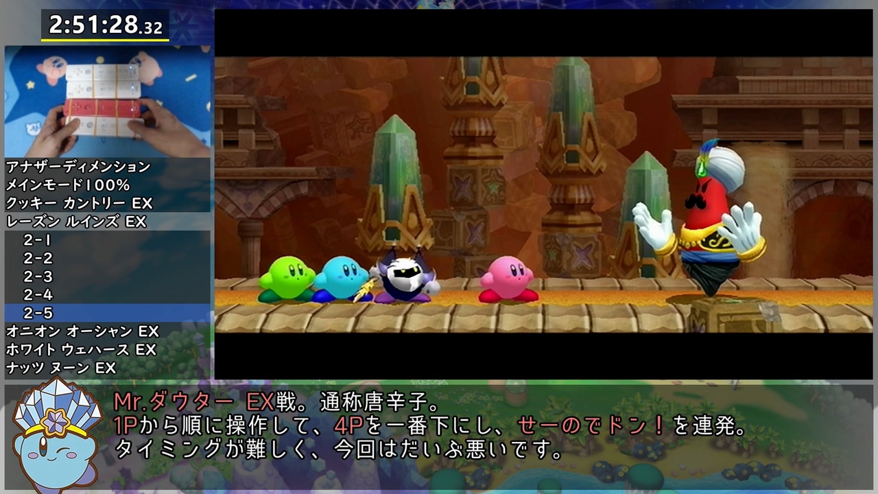 大変お待たせいたしました。<br>先に完成させてしまった方が楽だったので遅くなってしまいました。すみません。<br>YouTubeには一括版を投稿済みです。<br><br>『星のカービィ Wii』の「Kirby Master (2P+)」のRTAのゆっくり解説動画です。<br><br>★ルール<br>メインモードを選択した瞬間に計測開始、「カービィマスター!」のムービーが再生されたら計測終了。<br>・メインモードを100%にする。<br>・エクストラモードを100%にする。<br>・格闘王への道をクリア。<br>・真 格闘王への道をクリア。<br><br>★プレイ環境<br>機種:Wii<br>バージョン:北米版<br>達成日:2023/09/15<br><br>★記録表<br><a href="https://www.speedrun.com/krtdl?h=Kirby_Master-2P&x=ndx7e352-5lypdzjl.5lmj5kjl" target="_blank" rel="noopener nofollow">https://www.speedrun.com/krtdl?h=Kirby_Master-2P&x=ndx7e352-5lypdzjl.5lmj5kjl</a><br><br>★最新のRTAチャート<br><a href="https://shirokirby.github.io/krtdl/" target="_blank" rel="noopener nofollow">https://shirokirby.github.io/krtdl/</a><br><br>★カービィシリーズRTA Discordサーバー<br><a href="https://discord.gg/vunx4HK" target="_blank" rel="noopener nofollow">https://discord.gg/vunx4HK</a><br><br>★Twitch<br><a href="https://www.twitch.tv/shirokirby" target="_blank" rel="noopener nofollow">https://www.twitch.tv/shirokirby</a><br><br>★Bluesky<br><a href="https://bsky.app/profile/shirokirby.bsky.social" target="_blank" rel="noopener nofollow">https://bsky.app/profile/shirokirby.bsky.social</a><br /><br>★投稿動画まとめ<br><a href="https://www.nicovideo.jp/mylist/59901580" target="_blank" rel="noopener">mylist/59901580</a><br><br>無断転載禁止