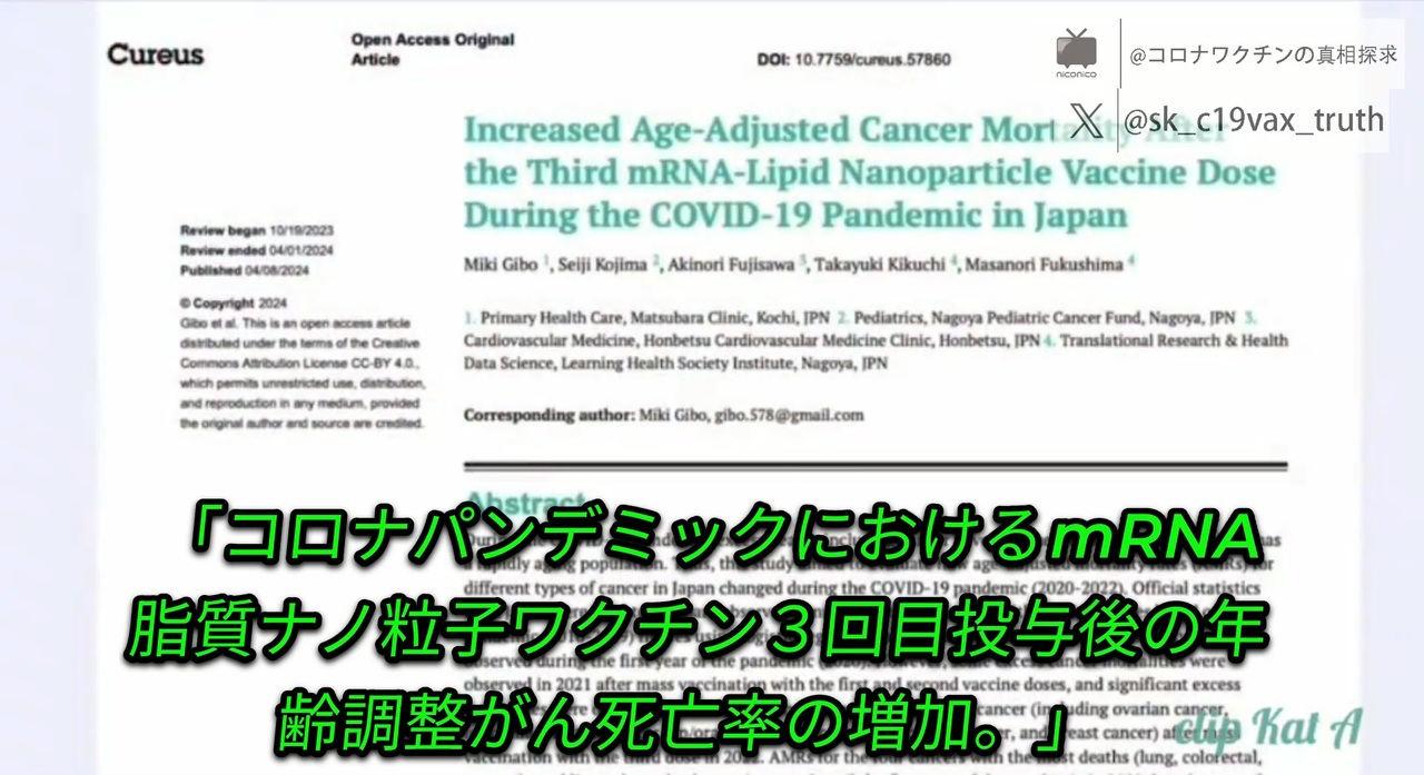 宜保先生、小島先生、藤沢先生、菊池先生、福島先生の論文がキャンベル博士による解説<br>(小島先生が「超過死亡討論会」でご紹介した論文が採択されました!)<br>・日本人が3回目以降の投与を受けた後の2022年に、すべてのがん死亡が有意に増加。<br>・卵巣がん、白血病、前立腺がん、口唇がん、口腔がん、咽頭がん、膵臓がん、乳がんの年齢別死亡率が著しい増加。<br>・ロックダウンによるがん治療の減少ではない。<br>・年齢調整後の統計である。<br>・ワクチン接種後にがんが発症または悪化した症例報告からみて、因果関係の可能性。<br>・最も毒性が強く、悪性度の高い癌に限って、数カ月から1年、あるいは2年以内に超過死亡をもたらすと推定。<br>元動画:<a href="https://x.com/SaiKate108/status/1779376282083746027" target="_blank" rel="noopener nofollow">https://x.com/SaiKate108/status/1779376282083746027</a><br><br><a target="_blank" href="https://qa.nicovideo.jp/faq/show/19424?site_domain=default" style="font-size: 13px;color: #657586; text-decoration: underline; line-height: 1.4">この動画は投稿者によって修正されました</a>