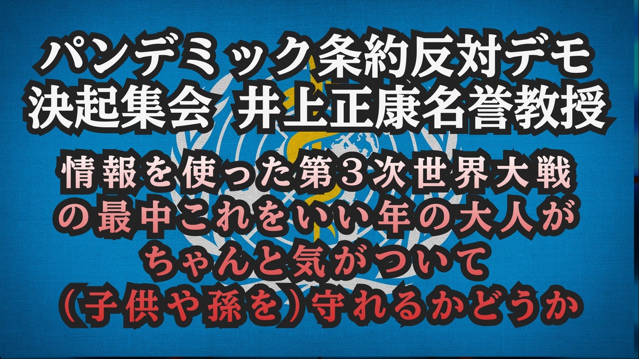 非常に邪悪なものが実際にある<br>一言で陰謀論というふうに言われますが、実は陰謀そのものが、実は大航海時代からずっと遺伝子として文化として続いてる。<br><br>そういうことに気がつきました。<br><br>そういう意味での今日の私のメッセージとしては、もう遺伝子で作った、海外で病原体タンパクを作らせるワクチン実装されても、例えば次はインフルエンザが来ます。<br><br>そしてサル痘とかね、いろんなもので今、はしかであおられています。<br><br>全てメッセンジャータイプでやるというのは、米国のグローバル製薬企業の基本戦略なってます。<br><br>それで皆さん方、仲間やお知り合いで、遺伝子ワクチンと有するものを体内ではどんな種類であっても、打ってはならない。<br><br>これを底本メッセージそれによって皆さん方のね、子供や孫を守っていただきたいと思います。<br><br>そういう意味では、半世紀経って、憧れだったWHO、これはこの4年間、無茶苦茶なことを指導してきた。<br><br>調べてみると、そのほとんどの85%以上のWHOの予算が実は製薬企業とか、ビル&メリンダ・ゲイツ財団とかいろんなステークホルダーの持ち物に使われて、育つ我々の健康そのものが武器として使われて今、情報を使った第3次世界大戦の最中が、これをいい年の大人がちゃんと気がついて守れるかどうか、これが我々の両親や祖父母が我々を守ってくれた結果として、我々今日までね、何とか生きてこれたんだと思います。<br><br><br>資料<br><a href="https://twitter.com/BGatesIsaPyscho/status/1779063069521416446?t=BokGMzZoWCtspIkKL2w42A&s=19" target="_blank" rel="noopener nofollow">https://twitter.com/BGatesIsaPyscho/status/1779063069521416446?t=BokGMzZoWCtspIkKL2w42A&s=19</a><br><br>資料2<br><a href="https://twitter.com/San3Sei57hT8hap/status/1779043193096679675?t=OJLlsed3kYp6M8fxOCaqQg&s=19" target="_blank" rel="noopener nofollow">https://twitter.com/San3Sei57hT8hap/status/1779043193096679675?t=OJLlsed3kYp6M8fxOCaqQg&s=19</a><br><br>資料3<br><a href="https://x.gd/ksyWu" target="_blank" rel="noopener nofollow">https://x.gd/ksyWu</a><br><br><br>珍しく時事通信社が<br>デモのニュースを報道。<br><a href="https://x.gd/pujUM" target="_blank" rel="noopener nofollow">https://x.gd/pujUM</a><br><br><br>井上正康名誉教授 決起集会 新型コロナウイルス ワクチン パンデミック条約反対デモ 池袋 WHO脱退 WHO IHR改定 ステークホルダー ビル&メリンダ・ゲイツ財団 パンデミック条約 製薬会社 予算 組織を私物化 遺伝子ワクチン mRNAワクチン インフルエンザ サル痘 はしか 次のパンデミック プランデミック メディア 陰謀 陰謀論<br><br><br />著作権、肖像権に配慮して作成しております。<br><br>◆気になったニュースの台本!?<br>メモ代わりに作った台本をそのままあげてます<br><a href="https://keiichiro8140.hatenablog.com/." target="_blank" rel="noopener nofollow">https://keiichiro8140.hatenablog.com/.</a><br><br><br>ここからはシリーズ紹介<br><br><br>◆ ワクチン解毒・デトックス<br><a href="https://x.gd/fZweg" target="_blank" rel="noopener nofollow">https://x.gd/fZweg</a><br><br>◆ウイリアム・マキス博士のがん治療(イベルメクチン・フェンベンダゾール等)<br><a href="https://x.gd/AtFYS" target="_blank" rel="noopener nofollow">https://x.gd/AtFYS</a><br><br>◆予防接種健康被害救済制度<br><a href="https://x.gd/0xK9x" target="_blank" rel="noopener nofollow">https://x.gd/0xK9x</a><br><br>◆気になったニュース #1501~<br><br>◆ 【ショートver】気になったニュース<br><a href="https://x.gd/7MxXC" target="_blank" rel="noopener nofollow">https://x.gd/7MxXC</a><br><br>◆ 気になったニュース #1001~<br><a href="https://x.gd/Lp8gv" target="_blank" rel="noopener nofollow">https://x.gd/Lp8gv</a><br><br>◆ 気になったニュース #501~<br><a href="https://x.gd/EmbS4" target="_blank" rel="noopener nofollow">https://x.gd/EmbS4</a><br><br>◆ 気になったニュース #1~#500<br><a href="https://x.gd/uPhNb" target="_blank" rel="noopener nofollow">https://x.gd/uPhNb</a><br><br>◆ X(旧Twitter)・テレグラムで気になった情報<br><a href="https://x.gd/YG6FT" target="_blank" rel="noopener nofollow">https://x.gd/YG6FT</a><br><br>◆ 日比谷5万人パレードデ⚪生放送アーカイブ動画<br><a href="https://x.gd/3CHJv" target="_blank" rel="noopener nofollow">https://x.gd/3CHJv</a><br><br>◆日比谷5万人パレード⚪モのマイリスト作ってみました<br><a href="https://nico.ms/mylist/76828848?ref=sp_other" target="_blank" rel="noopener nofollow">https://nico.ms/mylist/76828848?ref=sp_other</a><br><br>◆3.30 令和の百姓⚪⚪<br><a href="https://www.nicovideo.jp/series/511791?ref=garage_share_other" target="_blank" rel="noopener nofollow">https://www.nicovideo.jp/series/511791?ref=garage_share_other</a><br><br>◆ 及川幸久さんの【XNEWS】シリーズ<br><a href="https://x.gd/3k78K" target="_blank" rel="noopener nofollow">https://x.gd/3k78K</a><br><br>◆これまでの動画<a href="https://x.gd/sPXoJ" target="_blank" rel="noopener nofollow">https://x.gd/sPXoJ</a><br><br>◆もしも(BAN)の時のためのマイリンク集<a href="https://lit.link/K-16_News44" target="_blank" rel="noopener nofollow">https://lit.link/K-16_News44</a><br><br>