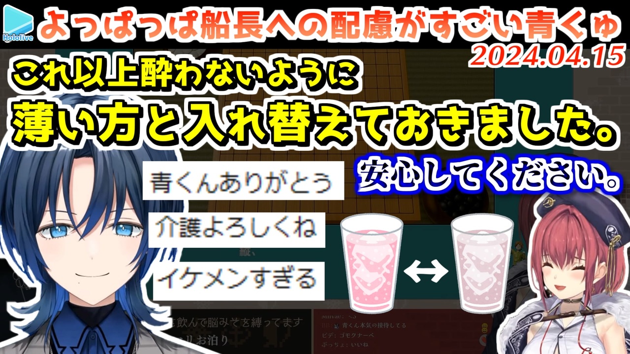 これはモテますわ<br><br><a href="#" class="seekTime" data-seekTime="00:00" onclick="seekNicoPlayer('#00:00'); return false;">#00:00</a> あ~らよっと<br><a href="#" class="seekTime" data-seekTime="01:19" onclick="seekNicoPlayer('#01:19'); return false;">#01:19</a> ヨット・生意気な後輩<br><a href="#" class="seekTime" data-seekTime="02:47" onclick="seekNicoPlayer('#02:47'); return false;">#02:47</a> 酔い始める<br><a href="#" class="seekTime" data-seekTime="06:23" onclick="seekNicoPlayer('#06:23'); return false;">#06:23</a> お水をたくさん飲ませたい・ウサギと猟犬<br><a href="#" class="seekTime" data-seekTime="08:50" onclick="seekNicoPlayer('#08:50'); return false;">#08:50</a> こっそり入れ替えました・五目並べ<br><br>元動画様はこちら<br>【#青マリお泊り】酔っぱらい脳みそ縛りバトル【ホロライブ/宝鐘マリン】<br><a href="https://youtu.be/0epaRXNIEDI" target="_blank" rel="noopener nofollow">https://youtu.be/0epaRXNIEDI</a><br><br>Marine Ch. 宝鐘マリン <a href="https://t.co/8WZjV1i70E" target="_blank" rel="noopener nofollow">https://t.co/8WZjV1i70E</a><br>Ao Ch. 火威青 ‐ ReGLOSS <a href="https://t.co/PGeNEqpstL" target="_blank" rel="noopener nofollow">https://t.co/PGeNEqpstL</a><br /><span style="color: #b7b7b7; font-size: 10px;">ホロライブ切り抜き/なめたけ <a href="https://t.co/CBwJLnYR2c" target="_blank" rel="noopener nofollow">https://t.co/CBwJLnYR2c</a></span>