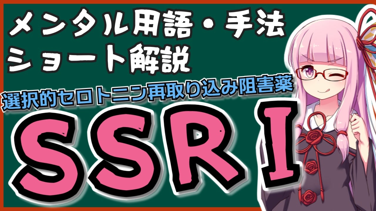 ▼使用ソフト<br>A.I.VOICE2 琴葉姉妹<br><br>▼参考資料<br>ゆうメンタルクリニックコラム<br>「抗うつ薬って、どうして効くの?~SSRI」<br><a href="https://yuik.net/man/403.html" target="_blank" rel="noopener nofollow">https://yuik.net/man/403.html</a><br><br>日経メディカル<br>「SRI(選択的セロトニン再取り込み阻害薬)の解説」<br><a href="https://medical.nikkeibp.co.jp/inc/all/drugdic/article/556e7e5c83815011bdcf827f.html" target="_blank" rel="noopener nofollow">https://medical.nikkeibp.co.jp/inc/all/drugdic/article/556e7e5c83815011bdcf827f.html</a><br><br><br>▼素材をお借りしたサイト<br>立ち絵 <br> 琴葉姉妹 坂本アヒル様:<br> <a href="https://seiga.nicovideo.jp/seiga/im10854789" target="_blank" rel="noopener nofollow">https://seiga.nicovideo.jp/seiga/im10854789</a><br> 琴葉姉妹 blueberry様:<br> <a href="https://seiga.nicovideo.jp/seiga/im5985123" target="_blank" rel="noopener nofollow">https://seiga.nicovideo.jp/seiga/im5985123</a><br>動画 動画素材.com様:<a href="http://xn--hhro09bn9j8uh.com" target="_blank" rel="noopener nofollow">http://xn--hhro09bn9j8uh.com</a><br>曲 MusMus様:<a href="https://musmus.main.jp/" target="_blank" rel="noopener nofollow">https://musmus.main.jp/</a><br>背景<br> 和室 シュガ様:<a href="https://commons.nicovideo.jp/works/nc226317" target="_blank" rel="noopener nofollow">https://commons.nicovideo.jp/works/nc226317</a>