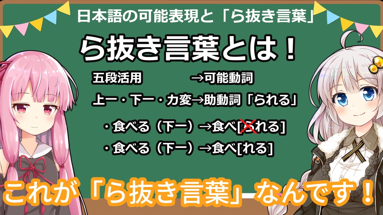 ら抜き言葉について初歩の初歩から解説しています。<br>ら抜き言葉を理解するには動詞の活用と動詞の活用の種類を理解する必要があります。わかりやすく解説してみましたのでぜひご覧ください。<br><br>【参考文献】<br>学校で教えてきている現代日本語の文法【右文書院】<br>くわしい中学国文法【文英堂】<br>日本語文法大辞典【大修館書店】<br>日本語文法がわかる事典 新装版【東京堂出版】<br>初級を教える人のための日本語文法ハンドブック【スリーエーネットワーク】<br><br>00:00 開始<br>01:05 学校文法とは?①動詞の活用形<br>05:15 学校文法とは?②活用形の種類<br>09:30 可能表現と「ら抜き言葉」<br>12:33 「ら抜き言葉」の使用率<br><br>【文化庁ホームページ】<br>国語に関する世論調査<br><a href="https://www.bunka.go.jp/tokei_hakusho_shuppan/tokeichosa/kokugo_yoronchosa/index.html" target="_blank" rel="noopener nofollow">https://www.bunka.go.jp/tokei_hakusho_shuppan/tokeichosa/kokugo_yoronchosa/index.html</a><br><br>【立ち絵】<br>おみなえし様 <a href="https://seiga.nicovideo.jp/seiga/im8261050" target="_blank" rel="noopener nofollow">https://seiga.nicovideo.jp/seiga/im8261050</a> <br>てけひろ様 <a href="https://seiga.nicovideo.jp/seiga/im10713053" target="_blank" rel="noopener nofollow">https://seiga.nicovideo.jp/seiga/im10713053</a> <br>【SE】 ポケットサウンド様 効果音ラボ様