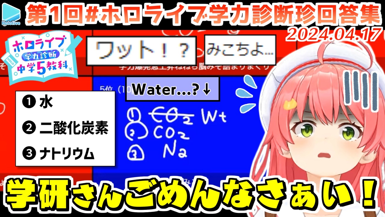 学俺恥<br><br><a href="#" class="seekTime" data-seekTime="00:00" onclick="seekNicoPlayer('#00:00'); return false;">#00:00</a> 提供:Gakkenさん<br><a href="#" class="seekTime" data-seekTime="01:26" onclick="seekNicoPlayer('#01:26'); return false;">#01:26</a> 国語:めしました<br><a href="#" class="seekTime" data-seekTime="02:30" onclick="seekNicoPlayer('#02:30'); return false;">#02:30</a> 理科:ワット<br><a href="#" class="seekTime" data-seekTime="03:43" onclick="seekNicoPlayer('#03:43'); return false;">#03:43</a> 数学:平方cm<br><a href="#" class="seekTime" data-seekTime="04:51" onclick="seekNicoPlayer('#04:51'); return false;">#04:51</a> 数学:たい焼き<br><a href="#" class="seekTime" data-seekTime="07:31" onclick="seekNicoPlayer('#07:31'); return false;">#07:31</a> 社会:先生の...<br><a href="#" class="seekTime" data-seekTime="09:14" onclick="seekNicoPlayer('#09:14'); return false;">#09:14</a> 英語:それとって<br><a href="#" class="seekTime" data-seekTime="10:52" onclick="seekNicoPlayer('#10:52'); return false;">#10:52</a> 結果発表<br><br>元動画様はこちら<br>【 ホロ学力テスト 】第一回ホロ中学5教科抜き打ち学力テスト対決!!<br><a href="https://youtu.be/Cz6t9Fg-J8c" target="_blank" rel="noopener nofollow">https://youtu.be/Cz6t9Fg-J8c</a><br><br>【ホロ小学力テスト対決】ホロ小学校学力テスト対決!星街すいせいちゃんvsさくらみこちゃん<br><a href="https://youtu.be/j82vVRh3nMU" target="_blank" rel="noopener nofollow">https://youtu.be/j82vVRh3nMU</a><br><br>Miko Ch. さくらみこ <a href="https://t.co/FM8eBkuiOO" target="_blank" rel="noopener nofollow">https://t.co/FM8eBkuiOO</a><br>Noel Ch. 白銀ノエル <a href="https://t.co/LY1ZFzkCSc" target="_blank" rel="noopener nofollow">https://t.co/LY1ZFzkCSc</a><br>Kanata Ch. 天音かなた <a href="https://t.co/rVcDJmho1o" target="_blank" rel="noopener nofollow">https://t.co/rVcDJmho1o</a><br>Nene Ch.桃鈴ねね <a href="https://t.co/ZKkIB3TE9S" target="_blank" rel="noopener nofollow">https://t.co/ZKkIB3TE9S</a><br>Lui ch. 鷹嶺ルイ - holoX - <a href="https://t.co/FT5ZgISmcf" target="_blank" rel="noopener nofollow">https://t.co/FT5ZgISmcf</a><br>Koyori ch. 博衣こより - holoX - <a href="https://t.co/U4G9NUjWs5" target="_blank" rel="noopener nofollow">https://t.co/U4G9NUjWs5</a><br /><span style="color: #b7b7b7; font-size: 10px;">ホロライブ切り抜き/なめたけ <a href="https://t.co/CBwJLnYR2c" target="_blank" rel="noopener nofollow">https://t.co/CBwJLnYR2c</a></span>