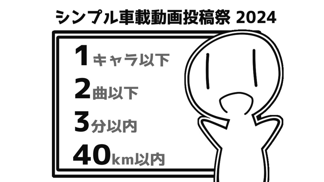 投稿祭の主催2回目は初めてなので、初投稿です。<br>投稿祭のタイトルは「<strong>シンプル車載動画投稿祭</strong>」です。去年と一緒です。<br>分かりやすく言うと、自分がいつも投稿しているような車載動画をみんなで投稿して、みんなで視聴いませんか?っていう企画です。<br><br>2024年5月21日 追記を作りました <a href="https://www.nicovideo.jp/watch/sm43802252" class="watch">sm43802252</a><br>2024年6月3日 ロゴの人の立ち絵を公開しました <a href="https://seiga.nicovideo.jp/seiga/im11453724" target="_blank" rel="noopener">im11453724</a><br>2024年8月5日 開催日追加しました。詳細について記載しました。<br><br><strong>■開催期間</strong><br> 第一弾 2024年7月2日(火)~7月15日(月・祝日)<br> 第二弾 2024年8月19日(月)~9月1日(日)<br><br><strong>■レギュレーション</strong><br>・登場するキャラは<span style="font-size: 16px;"><strong>1</strong></span><span style="font-size: 16px;">キャラ</span>以下。<br>・使用するBGMは<span style="font-size: 16px;"><strong>2</strong></span><span style="font-size: 16px;">曲</span>以下。<br>・動画の長さは<span style="font-size: 16px;"><strong>3</strong></span><span style="font-size: 16px;">分</span>以内。<br>・目的地から<span style="font-size: 16px;"><strong>40</strong></span><span style="font-size: 16px;">km</span>以内をスタート地点にする。<br>・投稿祭に投稿できるのは<strong>一人1本</strong>。<br><br><strong>■補足</strong><br>・投稿した動画には「<strong>シンプル車載動画投稿祭</strong>」とタグをつけて、タグロックをしてください。<br>・ロゴを使用したい場合はニコニコ静画 <a href="https://seiga.nicovideo.jp/seiga/im11414560" target="_blank" rel="noopener">im11414560</a> を使用してください(使わないでもOKです)。<br>・可能であれば、この動画を親登録していただけると投稿に気づきやすくて助かります。<br>・詳細はニコニコ大百科を参照してください。<br><br>詳しくは特設ページにて。<br> <a href="https://x.gd/SfmvI" target="_blank" rel="noopener nofollow">https://x.gd/SfmvI</a><br>
