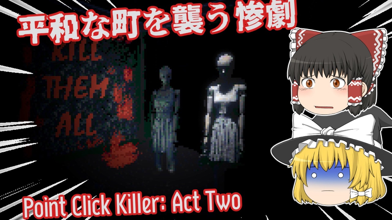 前作⇒<a href="https://www.nicovideo.jp/watch/sm42943965" class="watch">sm42943965</a><br><br>本動画は東方Projectの二次創作です。 <br><br>ゆっくり霊夢とゆっくり魔理沙が海外のホラーゲームに挑むようです。<br><br>◎あらすじ◎<br>モーテルの宿泊客たちを襲った殺人鬼を追うべく、主人公のクラーク刑事は捜査を始める。<br>そんな彼の行く先々には不穏な影が…?<br><br>VOICEVOX:青山龍星<br>VOICEVOX:玄野武宏<br><a href="https://voicevox.hiroshiba.jp/" target="_blank" rel="noopener nofollow">https://voicevox.hiroshiba.jp/</a><br><br>COEIROINK:豪徳貞江<br>COEIROINK:おふとんP<br>COEIROINK:AI声優-青葉<br>COEIROINK:AI声優-金苗<br><a href="https://coeiroink.com/" target="_blank" rel="noopener nofollow">https://coeiroink.com/</a><br><br>※投稿者のガバ翻訳付きです。<br>配信ページ 日本語非対応<br><a href="https://thrive.itch.io/point-click-killer-act-two" target="_blank" rel="noopener nofollow">https://thrive.itch.io/point-click-killer-act-two</a><br><br>BGMをお借りしました。<br><a href="https://otologic.jp/" target="_blank" rel="noopener nofollow">https://otologic.jp/</a>