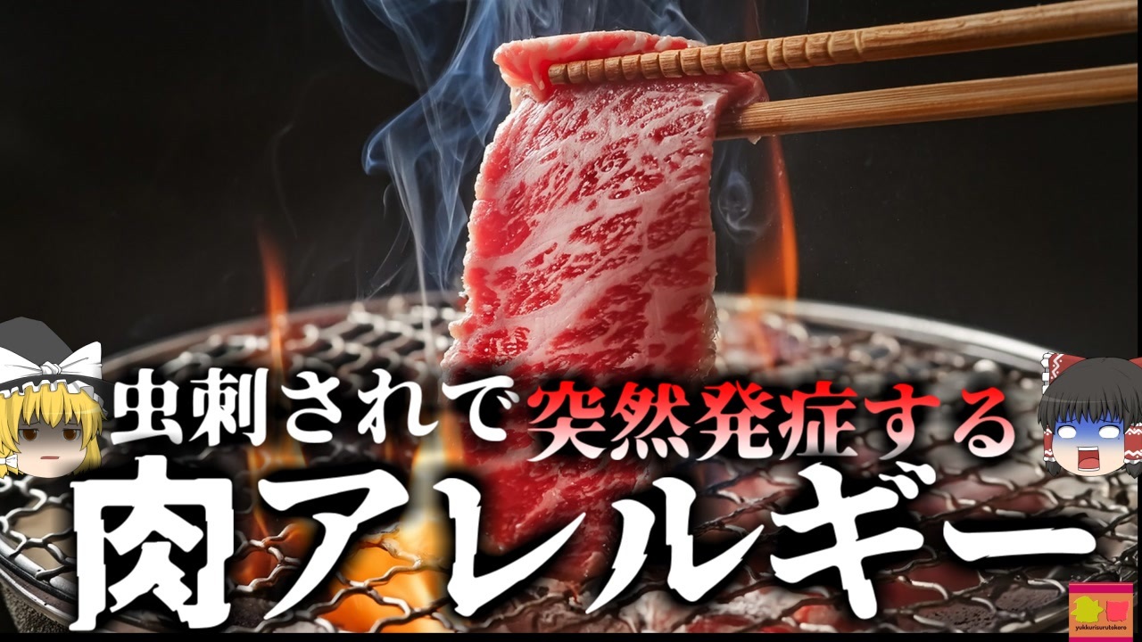 <a href="#" class="seekTime" data-seekTime="00:00" onclick="seekNicoPlayer('#00:00'); return false;">#00:00</a> OP<br><a href="#" class="seekTime" data-seekTime="00:20" onclick="seekNicoPlayer('#00:20'); return false;">#00:20</a> 建築士のAさん<br><a href="#" class="seekTime" data-seekTime="1:13" onclick="seekNicoPlayer('#1:13'); return false;">#1:13</a> 焼肉を食べていたが・・・<br><a href="#" class="seekTime" data-seekTime="2:09" onclick="seekNicoPlayer('#2:09'); return false;">#2:09</a> 蕁麻疹と吐き気<br><a href="#" class="seekTime" data-seekTime="3:10" onclick="seekNicoPlayer('#3:10'); return false;">#3:10</a> 病院での検査<br><a href="#" class="seekTime" data-seekTime="3:40" onclick="seekNicoPlayer('#3:40'); return false;">#3:40</a> 肉アレルギー<br><a href="#" class="seekTime" data-seekTime="4:12" onclick="seekNicoPlayer('#4:12'); return false;">#4:12</a> アレルギーとは<br><a href="#" class="seekTime" data-seekTime="5:30" onclick="seekNicoPlayer('#5:30'); return false;">#5:30</a> 医師が疑った要因<br><a href="#" class="seekTime" data-seekTime="6:23" onclick="seekNicoPlayer('#6:23'); return false;">#6:23</a> 視聴上の注意<br><a href="#" class="seekTime" data-seekTime="6:39" onclick="seekNicoPlayer('#6:39'); return false;">#6:39</a> マダニ<br><a href="#" class="seekTime" data-seekTime="7:54" onclick="seekNicoPlayer('#7:54'); return false;">#7:54</a> 肉に似た糖質を含む唾液<br><a href="#" class="seekTime" data-seekTime="9:13" onclick="seekNicoPlayer('#9:13'); return false;">#9:13</a> 予防方法と対処法<br><br>今回紹介するのは、九州地方で発生した少し珍しいアレルギーに関する事例です。<br>九州の某都市に暮らしていた男性「Aさん」はこの日、仕事仲間と自宅で焼肉を食べていました。<br>彼は建築士として働く50代の男性で、焼肉が大好きだったこと、仕事関係の人と積極的にコミュニケーションをとるタイプだったこともあり、時折こうして自宅に人を招き、焼肉パーティを開催していました。<br>この日も無事に食事会が終わり、片付けをした後就寝していたAさんでしたが、夜中に手足のかゆみで目を覚ましました。<br>身体を確認してみると、そこにはびっしりと蕁麻疹の症状が。驚いたAさんは患部を氷で冷やそうと、台所に移動しようとしましたが、その途中の廊下で意識を失い倒れてしまいました。<br>大きな音に目を覚ました彼の妻によって、Aさんは発見され救急車で病院に運ばれて行き、そこで医師の処置を受けました。<br>医師は彼の症状を見て、何らかのアレルギー性のショックが起きたと考え、検査を行ったところ、なんとAさんは「ウシアレルギー」を発症していたのです。<br>これまで幾度となく、大好きな牛肉を食べていたのに、なぜ彼は突然牛のアレルギーになってしまったのでしょうか?<br><br>引用・出展・参考文献<br>厚生労働省 ダニ媒介感染症<br><a href="https://ishort.ink/8A1h" target="_blank" rel="noopener nofollow">https://ishort.ink/8A1h</a><br>東京都保健医療局 マダニ<br><a href="https://ishort.ink/mtRW" target="_blank" rel="noopener nofollow">https://ishort.ink/mtRW</a><br>KINCHO ウルトラがいちゅう大百科 マダニ<br><a href="https://ishort.ink/sWDX" target="_blank" rel="noopener nofollow">https://ishort.ink/sWDX</a><br><br><br><br />※この動画は過去の事件を知り、現在でも同じことが発生する危険性を再認識、関与しないように促すための動画であり、視聴者を扇動、動揺を誘うためのコンテンツではありません。<br><br>ご要望にお応えして、メンバーシップの開設を行いました。<br>下記URLからも登録可能ですので、ご興味がある方は是非ご参加ください。<br><a href="https://www.youtube.com/channel/UCcT5a1J7XJW7CLYI2RKl4pw/join" target="_blank" rel="noopener nofollow">https://www.youtube.com/channel/UCcT5a1J7XJW7CLYI2RKl4pw/join</a><br><br><br>Twitter<br>→<a href="https://twitter.com/yukkurisurutoko" target="_blank" rel="noopener nofollow">https://twitter.com/yukkurisurutoko</a><br><br>取り急ぎ、簡易的にですがマイリストを作りました。<br>【ゆっくり解説】事故・事件関係紹介リスト <br><a href="https://www.nicovideo.jp/mylist/71034319" target="_blank" rel="noopener nofollow">https://www.nicovideo.jp/mylist/71034319</a><br>【ゆっくり解説】放射線系事故<br><a href="https://www.nicovideo.jp/mylist/71034368" target="_blank" rel="noopener nofollow">https://www.nicovideo.jp/mylist/71034368</a><br>【ゆっくり解説】鉄道系事故・事件関連<br><a href="https://www.nicovideo.jp/mylist/71034379" target="_blank" rel="noopener nofollow">https://www.nicovideo.jp/mylist/71034379</a>