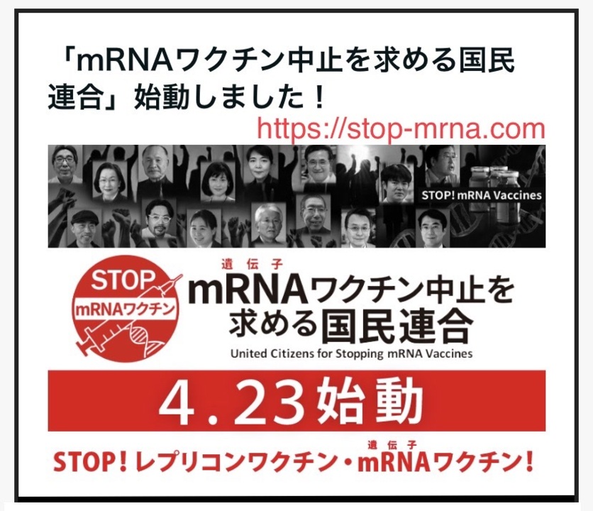 【拡散希望】「mRNAワクチンの中止を求める国民連合」に賛同と署名を!<br> 5/31(金)の巨大デモを前にして<br>最強のメンバーが、皆を呼びかけようと<br>本気で立ち上がった。<br><br>あなたの参加で<br>この運動は日本最強になる。<br>まずはHPから賛同や署名を。<br>フォローもぜひ□<br><br>●公式HP<br><a href="https://stop-mrna.com" target="_blank" rel="noopener nofollow">https://stop-mrna.com</a><br>★署名する(VOICE)<br><a href="https://voice.charity/events/721" target="_blank" rel="noopener nofollow">https://voice.charity/events/721</a><br>●公式X<br><a href="https://twitter.com/stop_mRNA_com" target="_blank" rel="noopener nofollow">https://twitter.com/stop_mRNA_com</a><br>●Xコミュニティに参加する<br><a href="https://twitter.com/i/communities/1772466796127526914" target="_blank" rel="noopener nofollow">https://twitter.com/i/communities/1772466796127526914</a><br><br>★フェイスブック<br><a href="https://www.facebook.com/profile.php?id=61558264067152" target="_blank" rel="noopener nofollow">https://www.facebook.com/profile.php?id=61558264067152</a><br>★インスタグラム<br><a href="https://www.instagram.com/stop.mrna.vaccines" target="_blank" rel="noopener nofollow">https://www.instagram.com/stop.mrna.vaccines</a>