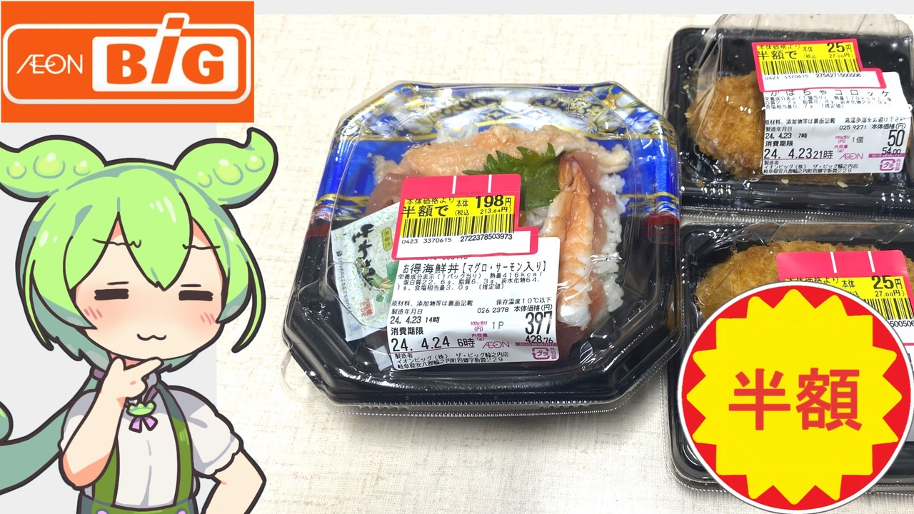 夜中に買い物に行ったのですがちょっとだけ半額のお惣菜が残っていたので買ってきました<br>海鮮丼のサーモンがいつもと違う色をしています、味はどうでしょうか?<br><br><br>【関連動画】<br>トップバリュの黄色いヤツや隠れトプバの「果汁100%りんごジュース」<br><a href="https://www.nicovideo.jp/watch/sm42784509" target="_blank" rel="noopener nofollow">https://www.nicovideo.jp/watch/sm42784509</a><br><br>【参考】<br>ビバタイム すっきりした味わいの2種の果実 ピーチテイスト(トップバリュ)<br><a href="https://www.topvalu.net/items/detail/4549414553291/" target="_blank" rel="noopener nofollow">https://www.topvalu.net/items/detail/4549414553291/</a><br><br>【使用した素材】(※敬称略)<br>(合成音声)VOICEVOX/ずんだもん/四国めたん<br><a href="https://voicevox.hiroshiba.jp/" target="_blank" rel="noopener nofollow">https://voicevox.hiroshiba.jp/</a><br>(立ち絵)坂本アヒル<br><a href="https://seiga.nicovideo.jp/seiga/im10788496" target="_blank" rel="noopener">im10788496</a>/<a href="https://seiga.nicovideo.jp/seiga/im10791276" target="_blank" rel="noopener">im10791276</a><br>(楽曲)甘茶の音楽工房/「楽しい麦畑」「フルーツパフェ」<br><a href="https://amachamusic.chagasi.com/" target="_blank" rel="noopener nofollow">https://amachamusic.chagasi.com/</a>