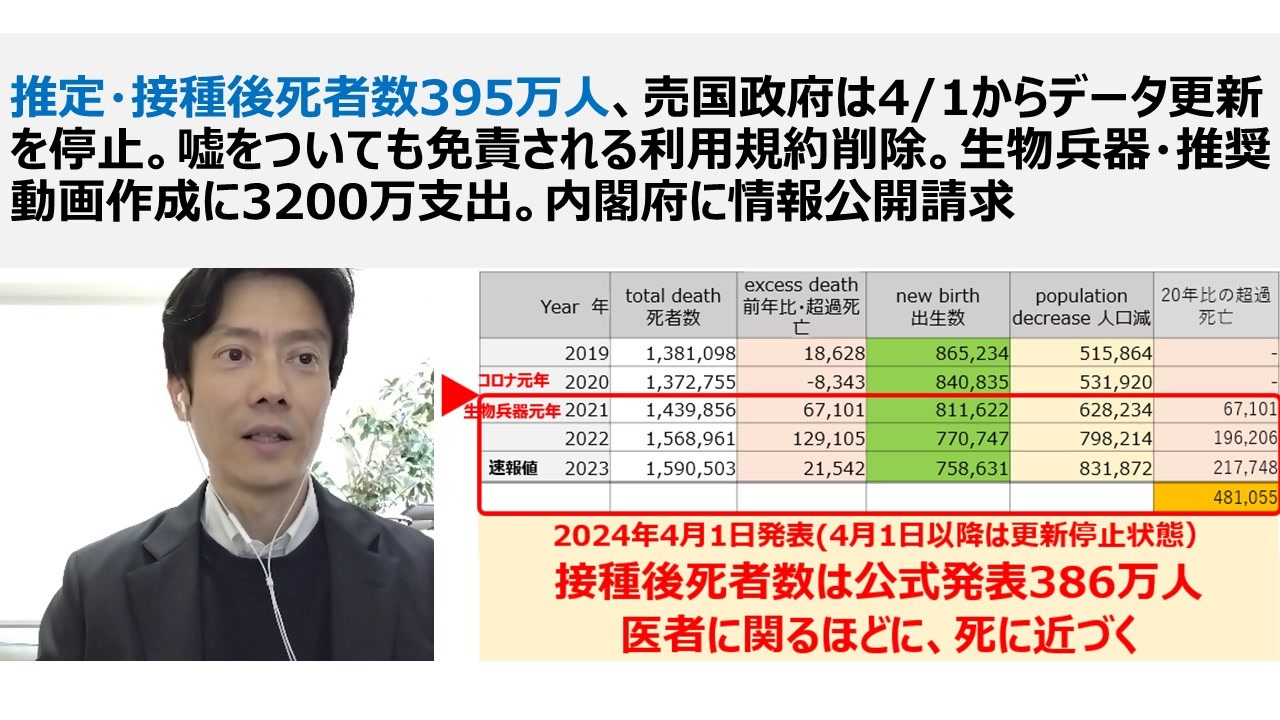死者数、出生数、超過死亡数の表<br><a href="https://ch.nicovideo.jp/sanada-nobuaki/blomaga/ar2153539" target="_blank" rel="noopener nofollow">https://ch.nicovideo.jp/sanada-nobuaki/blomaga/ar2153539</a><br><br>20年比較の累積の接種後死者数を演説で48万人と語らせて頂いています。<br>24年2月政府発表の23年速報値では48万人でいたが、24年6月発表の概算値で計算すると46万人です。<br>夏に確定した際に改めて数字を見直したいと思いますが、46から48万の間だと推定します。<br><br>首相官邸から移行された接種回数の公開サイト 2024年4月1日から更新なし<br><a href="https://www.mhlw.go.jp/stf/seisakunitsuite/bunya/kenkou_iryou/kenkou/kekkaku-kansenshou/yobou-sesshu/syukeihou_00002.html" target="_blank" rel="noopener nofollow">https://www.mhlw.go.jp/stf/seisakunitsuite/bunya/kenkou_iryou/kenkou/kekkaku-kansenshou/yobou-sesshu/syukeihou_00002.html</a><br><br>新型コロナワクチンに関する内部資料に記され<br> た「KOL」というインフルエンサーの存在【ワクチンのファクト⑫】<br> <a href="https://infact.press/2022/02/post-19332/?fbclid=IwAR1nwu7GQcgT5OqDaGu2fqj4Z0JlRNZ_94EhhHNGKYfm9zb9bRoe2bHv-HQ" target="_blank" rel="noopener nofollow">https://infact.press/2022/02/post-19332/?fbclid=IwAR1nwu7GQcgT5OqDaGu2fqj4Z0JlRNZ_94EhhHNGKYfm9zb9bRoe2bHv-HQ</a><br><br>国への出向者数と出身企業<br><a href="https://www.cas.go.jp/jp/gaiyou/jimu/jinjikyoku/pdf/ukeire_r051001.pdf" target="_blank" rel="noopener nofollow">https://www.cas.go.jp/jp/gaiyou/jimu/jinjikyoku/pdf/ukeire_r051001.pdf</a><br><br>日本国独立宣言論 私は独立を宣言する! 真田信秋<br><a href="https://amzn.to/3D90lwx" target="_blank" rel="noopener nofollow">https://amzn.to/3D90lwx</a><br> <br>主権者命令書 主権破壊を許すな 売国傀儡日本政府を解体せよ<br><a href="https://amzn.to/49z51b5" target="_blank" rel="noopener nofollow">https://amzn.to/49z51b5</a><br> <br>マトリックス洗脳社会 グローバル企業ディストピア<br><a href="https://amzn.to/4g2YmZg" target="_blank" rel="noopener nofollow">https://amzn.to/4g2YmZg</a><br><br>メディア廃棄宣言 高橋清隆さん<br><a href="https://amzn.to/3BfdYKg" target="_blank" rel="noopener nofollow">https://amzn.to/3BfdYKg</a>