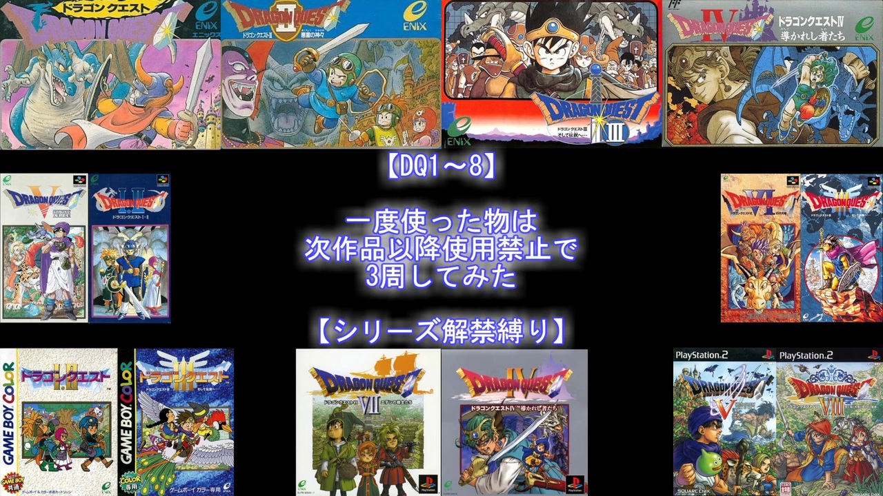 撮り溜めすること1年半。part0の投稿から1年と、大変長らくお待たせ致しました。<br>約束通り、ようやく冒険のスタートです。<br>まずはFC版DQⅠの世界から。全てはここから始まった!<br><br>前→<a href="https://www.nicovideo.jp/watch/sm42014725" class="watch">sm42014725</a><br>次→<a href="https://www.nicovideo.jp/watch/sm43769623" class="watch">sm43769623</a><br><br>YouTube版→<a href="https://youtu.be/GdbhYeyVZRE" target="_blank" rel="noopener nofollow">https://youtu.be/GdbhYeyVZRE</a><br><br>縛りルール<br>①一度使った武器・防具・装飾品・道具・呪文・特技は<br> 次作品以降使用禁止。(売却も解禁扱い)<br><br> 一度使った職業(3,6,7)・仲間モンスター(5,6)・スカウトモンスター(8)は<br> 戦士(Ⅲ)、戦士(Ⅵ)のようにナンバリングで分類し次作品以降使用禁止。<br> また複数体加入できる仲間モンスターは一体まで。<br><br>②裏技、バグ技、全滅、逃走、おどかす禁止。<br> またダンジョン攻略とボス戦における状況再現禁止。<br><br>③ダンジョンとボス攻略は、全キャラのレベルを突入時、<br> 1周目は目標レベル+5。2周目は+10。3周目は+15まで。<br> ラスボスの目標レベルは45。裏ボスは50とする。<br>(目標レベルは各公式ガイドブックを参照)<br><br>④1周目はEDまで。2周目は裏ボス撃破まで。<br> 3周目は全てのボスを規定回数、規定ターン以内に倒す。<br>(回避可能なボスも倒し、闇ゾーマは3周全てで倒す)<br><br>・プレイする機種<br>Ⅰ FC→SFC→GBC<br>Ⅱ FC→SFC→GBC<br>Ⅲ FC→SFC→GBC<br>Ⅳ FC→PS→スマホ<br>Ⅴ SFC→PS2→スマホ<br>Ⅵ SFC→スマホ→SFC<br>Ⅶ PS→PS→PS<br>Ⅷ PS2→PS2→PS2<br><br><span style="color: #262626;">※一部機種は互換機を使用してのプレイとなりますが、倍速機能やクイックセーブ・ロード、チートなどは一切使用しません。</span><br><br>※ネタバレ注意です<br><br>この動画で利用している株式会社スクウェア・エニックスを代表とする共同著作者が権利を所有する著作物及びスギヤマ工房有限会社が権利を所有する楽曲の転載・配布は禁止いたします。<br>(C) ARMOR PROJECT/BIRD STUDIO/SQUARE ENIX All Rights Reserved.<br>(C) SUGIYAMA KOBO (P) SUGIYAMA KOBO<br><br>AquesTalk2ライセンスID:AQTK2WINUSR23122185<br /><br><br>❤いいねを押していただけるとモチベーションと投稿速度が上がるので宜しくお願い致します!<br><br>作者ツイッター→ <a href="https://twitter.com/nig0117" target="_blank" rel="noopener nofollow">https://twitter.com/nig0117</a><br>PIXIV FANBOX→ <a href="https://sutanokeiji.fanbox.cc/" target="_blank" rel="noopener nofollow">https://sutanokeiji.fanbox.cc/</a><br><br>( 以前はWEB小説書いてました→ <a href="https://kakuyomu.jp/works/1177354054884910267" target="_blank" rel="noopener nofollow">https://kakuyomu.jp/works/1177354054884910267</a> )