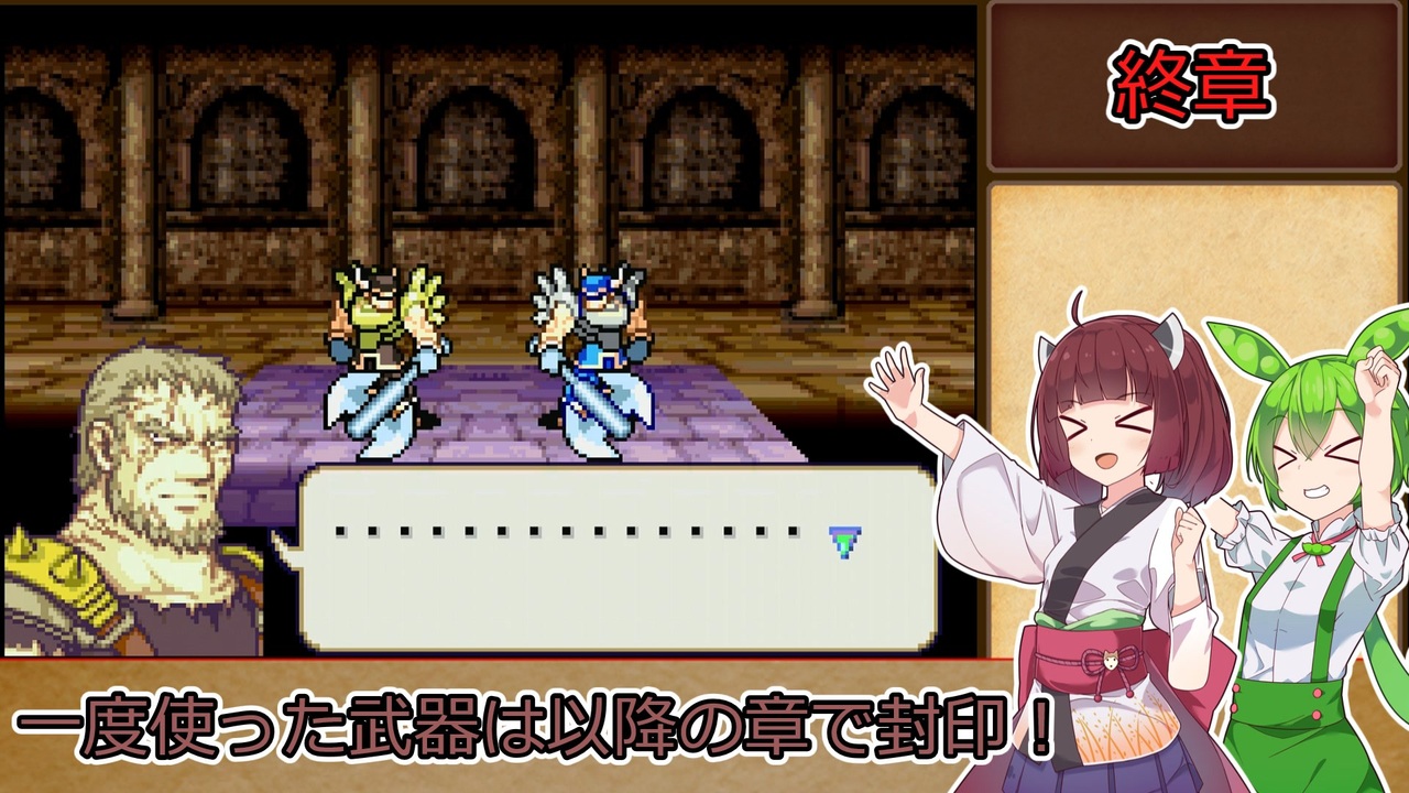 <span style="color: #85200c; font-size: 24px;"><strong><i>最強ウォーリア頂上決戦<br>バアトルvsブレンダン</i></strong></span><br><br><strong>ルール1:一度使用した武器種は、以降の章で使用する事を禁止する。<br>ルール2:武器の使用の定義は『その武器を装備した状態で敵との戦闘が発生したタイミング』『その武器を売却して換金した場合』杖の場合は『対象に対して使用した時点(命中の可否は問わない)』とする。</strong><br><span style="color: #ff0000;"><strong>※同盟軍、演出による戦闘イベントでは使用した判定にはならないこととする。</strong></span><br><strong>ルール3:難易度はリン編ハード→ヘクトル編ハードとする。<br>ルール4:序章から終章まで外伝、異伝を含む全ての章を攻略し、仲間に出来るユニットは全員加入させ、生存させる。(序章と1章のみ同一の章として扱う)</strong><br><span style="color: #ff0000; font-size: 18px;"><strong>※バグ技禁止</strong></span><br><br>本動画のシリーズリスト【<a href="https://www.nicovideo.jp/series/406473" target="_blank" rel="noopener">series/406473</a>】<br>前作の同縛りプレイ【<a href="https://www.nicovideo.jp/series/316824" target="_blank" rel="noopener">series/316824</a>】<br>前:【<a href="https://www.nicovideo.jp/watch/sm43688676" class="watch">sm43688676</a>】次:【<a href="https://www.nicovideo.jp/watch/sm43750743" class="watch">sm43750743</a>】<br><br><strong>使用したソフト</strong><br>VOICEROID+東北きりたんEX<br>VOICEPEAK 東北きりたん<br>VOICEPEAK ずんだもん<br><strong>お借りした素材</strong><br>ニコニコモンズの皆様(コンテンツツリー参照)