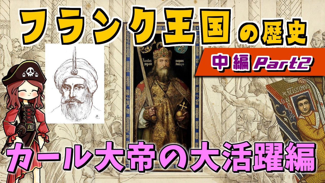 前編 →<a href="https://www.nicovideo.jp/watch/sm43578325" class="watch">sm43578325</a><br>中編1 →<a href="https://www.nicovideo.jp/watch/sm43633683" class="watch">sm43633683</a><br>フランク王国の歴史、中編のパート2です。<br>カール大帝の覇業をダラダラとお話します。<br><br>☆ご協力ありがとうございました☆<br>あまひ₁ちゃんねるさんのおすすめ動画(ようつべです)→<a href="https://www.youtube.com/watch?v=Vgyh1QlV2Ko" target="_blank" rel="noopener nofollow">https://www.youtube.com/watch?v=Vgyh1QlV2Ko</a><br>ホーム画面→ <a href="https://www.youtube.com/@user-dz6cw4fc4t" target="_blank" rel="noopener nofollow">https://www.youtube.com/@user-dz6cw4fc4t</a><br><br>会員向けニコニコチャンネル『モンド・ヒストリカの離宮』→ <a href="https://ch.nicovideo.jp/mond-historica" target="_blank" rel="noopener nofollow">https://ch.nicovideo.jp/mond-historica</a><br><br>今回の参考文献:<br>五十嵐修(2001)『地上の夢 キリスト教帝国』講談社<br>佐藤彰一(2013)『カール大帝 ヨーロッパの父』山川出版<br>レジーヌ・ル・ジャン(2009)『メロヴィング朝』加納修訳 白水社<br>池谷文夫 (2019)『神聖ローマ帝国 ドイツ王が支配した帝国』刀水書房<br>三佐川亮宏(2023)『オットー大帝』中央公論新社<br><br>その他 Wikipediaなど<br><br>twitter | <a href="https://twitter.com/Yukkuri_mond" target="_blank" rel="noopener nofollow">https://twitter.com/Yukkuri_mond</a><br />━━━━━━━━━━━━━━━━━━━━━<br><br>この動画はクリエイティブ・コモンズ継承(CC-BY-SA)ライセンスの素材を使用して制作しています。(<a href="https://creativecommons.org/licenses/by-sa/4.0/)" target="_blank" rel="noopener nofollow">https://creativecommons.org/licenses/by-sa/4.0/)</a><br>規約に基づき、この動画もCC-BY-SA 4.0 のもとで公開します。<br><br>投稿者共通情報☆彡<br><br>BGM, SE:ニコニ・コモンズ様<br><a href="http://commons.nicovideo.jp/" target="_blank" rel="noopener nofollow">http://commons.nicovideo.jp/</a><br>魔王魂様<br><a href="https://maoudamashii.jokersounds.com/" target="_blank" rel="noopener nofollow">https://maoudamashii.jokersounds.com/</a><br>Audiostock様<br><a href="https://audiostock.jp/" target="_blank" rel="noopener nofollow">https://audiostock.jp/</a><br><br>立ち絵 霊夢・魔理沙(黒子式):nicotalk様<br><a href="http://www.nicotalk.com/charasozai.html" target="_blank" rel="noopener nofollow">http://www.nicotalk.com/charasozai.html</a><br><br>立ち絵 パトラ、マリー、アン、メアリ:ライフライフ様<br><a href="https://0801lifelife.tumblr.com/" target="_blank" rel="noopener nofollow">https://0801lifelife.tumblr.com/</a><br><br>使用ツール1:ゆっくりムービーメーカー4<br><a href="https://manjubox.net/ymm4/" target="_blank" rel="noopener nofollow">https://manjubox.net/ymm4/</a><br><br>使用ツール2:AviUtl<br><a href="http://spring-fragrance.mints.ne.jp/aviutl/" target="_blank" rel="noopener nofollow">http://spring-fragrance.mints.ne.jp/aviutl/</a><br><br>各時代の地図 : World History Maps & Timelines <br><a href="http://geacron.com/home-en/" target="_blank" rel="noopener nofollow">http://geacron.com/home-en/</a><br><br>ゆっくりボイスについて:AquesTalkライセンス取得済み<br><br>キャラクターボイス<br>アン・ボニー:羽ノ華(A.I.VOICE)<br>メアリ・リード:琴葉 葵(A.I.VOICE)<br>クレオパトラ:結月ゆかり(VOICEROID2)<br>マリー‐アントワネット:東北きりたん (VOICEROID EX)<br>その他キャラ:青山龍星(A.I.VOICE)、伊織弓鶴(A.I.VOICE2)、栗田まろん(A.I.VOICE)、宮舞モカ(VOICEPEAK)、フリモメン(VOICEPEAK)<br><br><br><br>その他フリー素材ご提供元の皆様に圧倒的感謝<br>