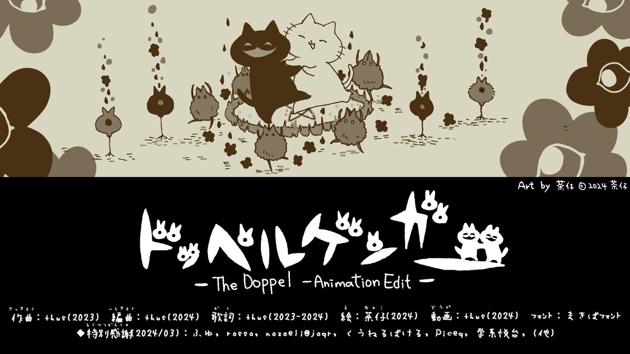 Art by 茶仔 © 2024 茶仔<br>(X:<a href="https://twitter.com/chacomalo" target="_blank" rel="noopener nofollow">https://twitter.com/chacomalo</a> )<br>―<br>◆「架空アニソン祭2024」出展作品<br>(詳細:<a href="https://twipla.jp/events/597871" target="_blank" rel="noopener nofollow">https://twipla.jp/events/597871</a> )<br>・主催:白乃秋(<a href="https://www.nicovideo.jp/user/207073" target="_blank" rel="noopener">user/207073</a> )<br>・公式アカウント(<a href="https://twitter.com/fictionanifes" target="_blank" rel="noopener nofollow">https://twitter.com/fictionanifes</a> )<br>―――<br><br> どうも、悪魔と戯れるthusです。カラオケ動画:<a href="https://www.nicovideo.jp/watch/sm43722759" class="watch">sm43722759</a><br> 規約に、どんなアニメを想定したか書くようにあるのでざっくり書けば、児童向けホラーアニメです。『学校の怪談』とか『怪談レストラン』とか『学校のコワイうわさ:花子さんがきた!!』とかですかね。でもやっぱり私が一番好きなのは、『学校のブロイうわさ:ブロ子さんがきた!!』(<a href="https://www.nicovideo.jp/watch/sm10440295" class="watch">sm10440295</a> )です。就中「さっちゃんのうわさ:ってなんだ?(バシュ)フンッ」の回(<a href="https://www.nicovideo.jp/watch/sm10440295" class="watch">sm10440295</a> )は神回だと思います。<br> 思えば、子どもと不思議ホラーは何処かセットで語られる事が多い様に思います。ほら例えば学校の七不思議とか、こっくりさんとか。児童向けホラーの絵本とか小説とか漫画とか、あるじゃないですか。其も小学1-2年ではなく、小学3-6年位の子どもに。其はきっと、見えない物に想像を膨らませると言うか、或る種の法則を見出そうとする帰納的推論の芽生えがあり、然し其は未だ芽生えという未熟なものであるが為に、幽霊の仕業だったりドッペルゲンガーの仕業だったりという根拠に乏しい原因帰結をするのだろうなと(後述の通り、間違った推論を愚かだと言いたい訳ではありません)。只然し其は、未熟ではあるものの、推論しようとする営みが其処に確かに育っているからこそなのです。だから、妖怪の所為なのねそうなのねというものを間違った推論だと論じる方が居たとしても、想像を匯らせる事は素敵な事であり大事な事であると、私は思います(53位のワッカさんもきっと其を見越して「素敵だね」って言うと思います(言わないか))。想像は創造でもあることは勿論、見方を変えれば仮説を立てている訳ですから。その違いは客観的根拠が有るか無いかです。未熟を経験せずに熟すことはありません。未熟があるからこそ熟すのです。ニャオハがマスカーニャに直接進化しないみたいに、最終進化系マスカーニャから見て相対的に未熟であるニャローテを経なければマスカーニャにはなれないのです。だから皆でマスカーニャを愛でましょう(間違った論証)。<br> だから論理的だ云々だなんて余り気にせず、沢山想像を匯らせましょう。論理に過度に拘泥すると貴方の芸術は科学に敗北しますよ。<br><br>2024/5/7 19:45:2,525▶<br>//10 5:13:1万▶<br /><br><br><br>====================<br>| 2026/01/04 21:00「インスペクタの自死未遂」:<a href="https://www.nicovideo.jp/watch/sm45800854" class="watch">sm45800854</a><br>| 投稿曲マイリスト:<a href="https://www.nicovideo.jp/mylist/57867175" target="_blank" rel="noopener">mylist/57867175</a><br>|――――――――――――――――――<br>| pixivFANBOX:<a href="https://thus.fanbox.cc/" target="_blank" rel="noopener nofollow">https://thus.fanbox.cc/</a><br>| アルバム等配信中:<a href="https://thus-library.blogspot.com/search/label/discography" target="_blank" rel="noopener nofollow">https://thus-library.blogspot.com/search/label/discography</a><br>| つなぐ(依頼・リクエスト):<a href="https://tsunagu.cloud/users/thus" target="_blank" rel="noopener nofollow">https://tsunagu.cloud/users/thus</a><br>|――――――――――――――――――<br>| YouTube:<a href="https://youtube.com/@thus" target="_blank" rel="noopener nofollow">https://youtube.com/@thus</a><br>| X:<a href="https://x.com/thus_submission" target="_blank" rel="noopener nofollow">https://x.com/thus_submission</a><br>| 他全リンク:<a href="https://lit.link/thus" target="_blank" rel="noopener nofollow">https://lit.link/thus</a><br>|――――――――――――――――――<br>| オフボーカル等:<a href="https://piapro.jp/thus_999discommunication" target="_blank" rel="noopener nofollow">https://piapro.jp/thus_999discommunication</a><br>| 楽曲/動画の二次利用に関して:<a href="https://bit.ly/3JRQQiZ" target="_blank" rel="noopener nofollow">https://bit.ly/3JRQQiZ</a><br><span style="color: #262626;">| </span><span style="color: #262626;"><strong>歌詞図書館(ふりがな有るよ!):</strong></span><a href="https://thus-library.blogspot.com/" target="_blank" rel="noopener nofollow">https://thus-library.blogspot.com/</a><br>====================