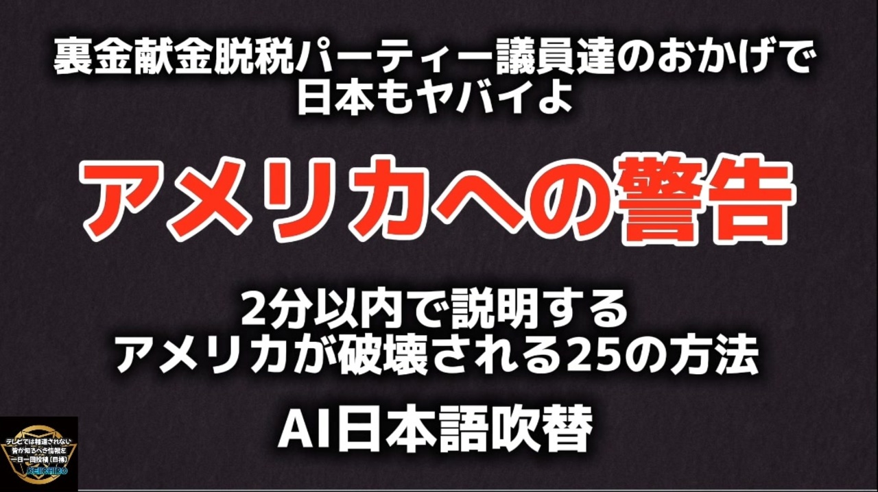 元動画 内容を疑う人は頑張って訳してみてください<br>↓<br>A Warning to America: 25 Ways the US is Being Destroyed | Explained in Under 2 Minutes<br><br><a href="https://twitter.com/WesternLensman/status/1782215645041451242?t=CQanIK7iPkB9OO_iwl3frw&s=19" target="_blank" rel="noopener nofollow">https://twitter.com/WesternLensman/status/1782215645041451242?t=CQanIK7iPkB9OO_iwl3frw&s=19</a><br><br><br>裏金献金脱税パーティー議員達のおかげで けで日本もヤバイよ<br><br>アメリカへの警告<br><br>2分以内で説明する アメリカを破壊する方法<br><br>AI日本語吹替<br><br><br>日本 アメリカ 岸田文雄 ジョー・バイデン 国を破壊 日本を破壊 アメリカを破壊 移民 国境 教育 薬物中毒 治安悪化 犯罪 フェンタニル 司法の武器化 選挙 不正選挙 私有財産 インフレ 借金 人口削減 世界的な人口削減計画 世界経済フォーラム 出生数の低下 低い出生率 説明責任 官僚 農薬 添加物 遺伝子組み換え作物 遺伝子組み換え食品 家畜へのワクチン接種 ワクチン パンデミック デマ 誤情報 利益相反 メディア 製薬会社 政府 偏向報道 不妊 核家族化 多様性 公平 人種差別 道徳 モラルの低下 戦争 戦争支援 ウクライナ支援 イスラエル支援 監視社会 政府の権力集中 検閲 メディア プロパガンダ メディア洗脳 誹謗中傷 異議を唱える者への誹謗中傷<br><br />著作権、肖像権に配慮して作成しております。<br><br>◆気になったニュースの台本!?<br>メモ代わりに作った台本をそのままあげてます<br><a href="https://keiichiro8140.hatenablog.com/." target="_blank" rel="noopener nofollow">https://keiichiro8140.hatenablog.com/.</a><br><br><br>ここからはシリーズ紹介<br><br><br>◆ ワクチン解毒・デトックス<br><a href="https://x.gd/fZweg" target="_blank" rel="noopener nofollow">https://x.gd/fZweg</a><br><br>◆ウイリアム・マキス博士のがん治療(イベルメクチン・フェンベンダゾール等)<br><a href="https://x.gd/AtFYS" target="_blank" rel="noopener nofollow">https://x.gd/AtFYS</a><br><br>◆予防接種健康被害救済制度<br><a href="https://x.gd/0xK9x" target="_blank" rel="noopener nofollow">https://x.gd/0xK9x</a><br><br>◆気になったニュース #1501~<br><br>◆ 【ショートver】気になったニュース<br><a href="https://x.gd/7MxXC" target="_blank" rel="noopener nofollow">https://x.gd/7MxXC</a><br><br>◆ 気になったニュース #1001~<br><a href="https://x.gd/Lp8gv" target="_blank" rel="noopener nofollow">https://x.gd/Lp8gv</a><br><br>◆ 気になったニュース #501~<br><a href="https://x.gd/EmbS4" target="_blank" rel="noopener nofollow">https://x.gd/EmbS4</a><br><br>◆ 気になったニュース #1~#500<br><a href="https://x.gd/uPhNb" target="_blank" rel="noopener nofollow">https://x.gd/uPhNb</a><br><br>◆ X(旧Twitter)・テレグラムで気になった情報<br><a href="https://x.gd/YG6FT" target="_blank" rel="noopener nofollow">https://x.gd/YG6FT</a><br><br>◆ 日比谷5万人パレードデ⚪生放送アーカイブ動画<br><a href="https://x.gd/3CHJv" target="_blank" rel="noopener nofollow">https://x.gd/3CHJv</a><br><br>◆日比谷5万人パレード⚪モのマイリスト作ってみました<br><a href="https://nico.ms/mylist/76828848?ref=sp_other" target="_blank" rel="noopener nofollow">https://nico.ms/mylist/76828848?ref=sp_other</a><br><br>◆3.30 令和の百姓⚪⚪<br><a href="https://www.nicovideo.jp/series/511791?ref=garage_share_other" target="_blank" rel="noopener nofollow">https://www.nicovideo.jp/series/511791?ref=garage_share_other</a><br><br>◆ 及川幸久さんの【XNEWS】シリーズ<br><a href="https://x.gd/3k78K" target="_blank" rel="noopener nofollow">https://x.gd/3k78K</a><br><br>◆これまでの動画<a href="https://x.gd/sPXoJ" target="_blank" rel="noopener nofollow">https://x.gd/sPXoJ</a><br><br>◆もしも(BAN)の時のためのマイリンク集<a href="https://lit.link/K-16_News44" target="_blank" rel="noopener nofollow">https://lit.link/K-16_News44</a><br><br>