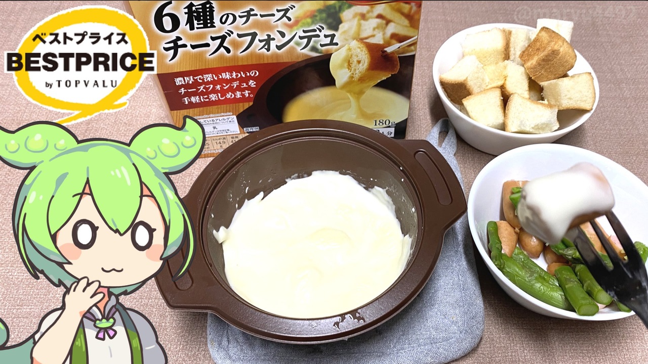 これさえあれば家で簡単にチーズフォンデュが楽しめます。<br><br><br>【参考】<br>レンジ用6種のチーズ チーズフォンデュ(トップバリュ)<br><a href="https://www.topvalu.net/items/detail/4549414549355/" target="_blank" rel="noopener nofollow">https://www.topvalu.net/items/detail/4549414549355/</a><br>特級あらびきポークウインナー(トップバリュ)<br><a href="https://www.topvalu.net/items/detail/4549414448566/" target="_blank" rel="noopener nofollow">https://www.topvalu.net/items/detail/4549414448566/</a><br>カットアスパラガス(トップバリュ)<br><a href="https://www.topvalu.net/items/detail/4549414520569/" target="_blank" rel="noopener nofollow">https://www.topvalu.net/items/detail/4549414520569/</a><br>ベーカーズアンドベーカリー 毎日の食卓食パン(トップバリュ)<br><a href="https://www.topvalu.net/items/detail/4549414538915/" target="_blank" rel="noopener nofollow">https://www.topvalu.net/items/detail/4549414538915/</a><br>マリンフード株式会社<br><a href="https://www.marinfood.co.jp/" target="_blank" rel="noopener nofollow">https://www.marinfood.co.jp/</a><br>チーズ・フォンデュの歴史と食べ方(一般社団法人 日本チーズ・フォンデュ協会)<br><a href="http://love-cheese.jp/about/" target="_blank" rel="noopener nofollow">http://love-cheese.jp/about/</a><br><br>【使用した素材】(※敬称略)<br>(合成音声)VOICEVOX/ずんだもん/四国めたん<br><a href="https://voicevox.hiroshiba.jp/" target="_blank" rel="noopener nofollow">https://voicevox.hiroshiba.jp/</a><br>(立ち絵)坂本アヒル<br><a href="https://seiga.nicovideo.jp/seiga/im10788496" target="_blank" rel="noopener">im10788496</a>/<a href="https://seiga.nicovideo.jp/seiga/im10791276" target="_blank" rel="noopener">im10791276</a><br>(楽曲)甘茶の音楽工房/「楽しい麦畑」「フルーツパフェ」「お城の舞踏会」<br><a href="https://amachamusic.chagasi.com/" target="_blank" rel="noopener nofollow">https://amachamusic.chagasi.com/</a>