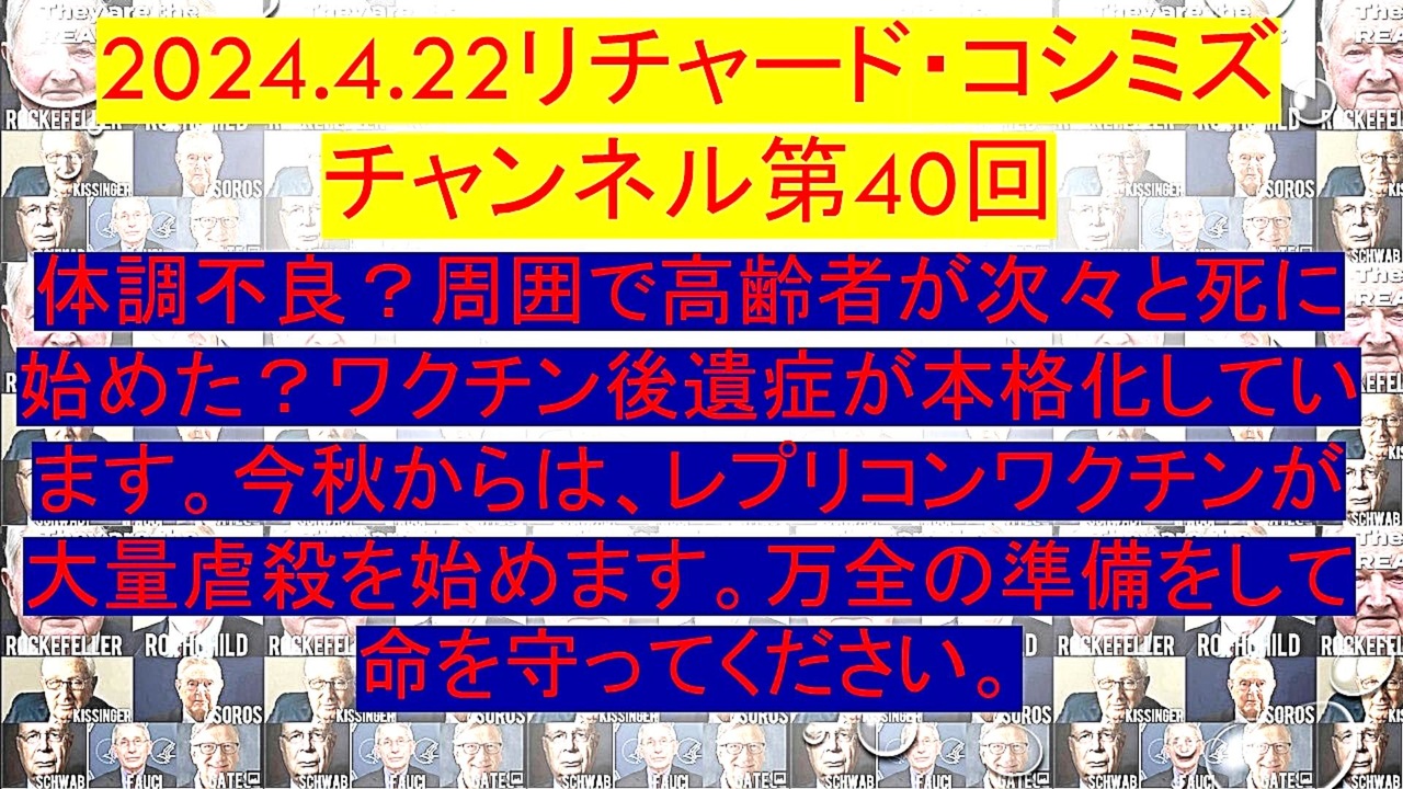 <span style="color: #ff0000;"><strong>「『 体調不良? 』 周囲で『 高齢者が次々と死に始めた? 』『 ワクチン後遺症 』が『 本格化 』しています。<br> 『 今秋 』からは、『 レプリコンワクチン 』が『 大量虐殺 』を始めます。『 万全の準備 』をして『 命 』<br> を『 守ってください 』」</strong></span><br><br><span style="color: #38761d;"><strong> ◐ リチャード・コシミズ・チャンネル⦅ ニコニコ チャンネル ⦆</strong></span><br> <span style="color: #0000ff;"><strong><a href="https://ch.nicovideo.jp/richardkoshimizu" target="_blank" rel="noopener nofollow">https://ch.nicovideo.jp/richardkoshimizu</a></strong></span><br><br><span style="color: #38761d;"><strong> ◐ リチャード・コシミズ『 ニコニコ生放送⦅ LIVE ⦆』</strong></span> <br> <span style="color: #0000ff;"><strong><a href="https://www.nicovideo.jp/user/120930363/live_programs" target="_blank" rel="noopener nofollow">https://www.nicovideo.jp/user/120930363/live_programs</a></strong></span><br><br><span style="color: #38761d;"><strong> ◐ リチャード・コシミズ『 Rumble 』公式 動画ギャラリー</strong></span><br> <span style="color: #0000ff;"><strong><a href="https://rumble.com/user/richardkoshimizu" target="_blank" rel="noopener nofollow">https://rumble.com/user/richardkoshimizu</a></strong></span><br><br><span style="color: #38761d;"><strong> ◐ リチャード・コシミズ『 ニコニコ動画⦅ 全動画 ⦆』公式 動画ギャラリー</strong></span><br> <span style="color: #0000ff;"><strong><a href="https://www.nicovideo.jp/user/121957117/video" target="_blank" rel="noopener nofollow">https://www.nicovideo.jp/user/121957117/video</a></strong></span><br> <br><br>