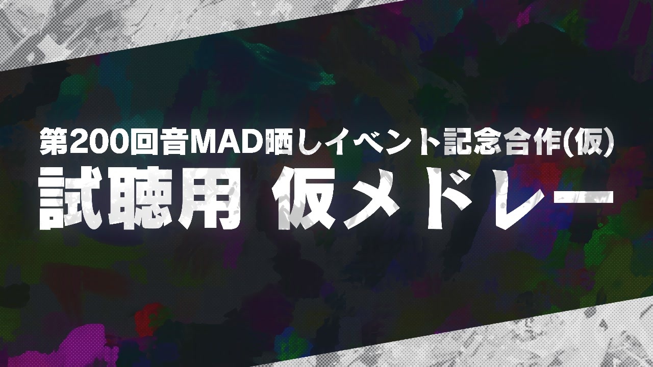 <s>第200回音MAD晒しイベントに向けて</s><strong><s>公募制合作が企画中</s></strong><s>です。<br>使用される</s><strong><s>メドレー</s></strong><s>は当合作に向けた</s><strong><s>新規書き下ろし</s></strong><s>!<br><br>現在、仮打ち込みの状態ですが、<br>参加者の皆さんへ、使用されている曲やメドレーの雰囲気を知ってもらうために公開します!<br>参加を検討されている方は是非聞いてみてください。</s><br><br><span style="font-size: 24px;"><strong>合作が完成しました!</strong></span><br><span style="font-size: 18px;"><strong>合作本編「Prism」:<a href="https://www.nicovideo.jp/watch/sm44708346" class="watch">sm44708346</a><br>メドレー:<a href="https://www.nicovideo.jp/watch/sm44711898" class="watch">sm44711898</a></strong></span><br><br><strong>募集動画</strong>:<a href="https://www.nicovideo.jp/watch/sm43721006" class="watch">sm43721006</a><br><strong>パート表</strong>:<a href="https://docs.google.com/spreadsheets/d/1mI46QGU9Eim-yHY1v4TqB0G4yZffUFkkHElXP94mSXU/edit" target="_blank" rel="noopener nofollow">https://docs.google.com/spreadsheets/d/1mI46QGU9Eim-yHY1v4TqB0G4yZffUFkkHElXP94mSXU/edit</a><br><strong>合作概要</strong>:<a href="https://note.com/level6/n/nc67fa6ba9330" target="_blank" rel="noopener nofollow">https://note.com/level6/n/nc67fa6ba9330</a><br><br><span style="font-size: 16px;"><strong>メドレー担当者 (敬称略、パート順)</strong></span><br>【Kyoro】 (<a href="https://www.nicovideo.jp/user/48539410" target="_blank" rel="noopener">user/48539410</a>)<br>まるてん (<a href="https://www.nicovideo.jp/user/37176832" target="_blank" rel="noopener">user/37176832</a>)<br>記事口授 (<a href="https://www.nicovideo.jp/user/20821962" target="_blank" rel="noopener">user/20821962</a>)<br>Y.むるか.S (<a href="https://www.nicovideo.jp/user/46766352" target="_blank" rel="noopener">user/46766352</a>)<br>Ximco (<a href="https://www.nicovideo.jp/user/50136284" target="_blank" rel="noopener">user/50136284</a>)<br>うせ (<a href="https://www.nicovideo.jp/user/58228001" target="_blank" rel="noopener">user/58228001</a>)<br>エルミナス (<a href="https://www.nicovideo.jp/user/79976564" target="_blank" rel="noopener">user/79976564</a>)<br>ああああぁぁぁぁぁぁああああああ (<a href="https://www.nicovideo.jp/user/117122479" target="_blank" rel="noopener">user/117122479</a>)<br>エンJ (<a href="https://www.nicovideo.jp/user/29976529" target="_blank" rel="noopener">user/29976529</a>)<br>まふゆ (<a href="https://www.nicovideo.jp/user/130286419" target="_blank" rel="noopener">user/130286419</a>)<br>miル (<a href="https://www.nicovideo.jp/user/40378416" target="_blank" rel="noopener">user/40378416</a>)<br>アマハム2 (<a href="https://www.nicovideo.jp/user/78033314" target="_blank" rel="noopener">user/78033314</a>)<br>49six. (<a href="https://twitter.com/relative_path" target="_blank" rel="noopener nofollow">https://twitter.com/relative_path</a> )<br>適当猫 (<a href="https://www.nicovideo.jp/user/25348121" target="_blank" rel="noopener">user/25348121</a>)<br>絶望劣等星 (<a href="https://www.nicovideo.jp/user/38929409" target="_blank" rel="noopener">user/38929409</a>)<br>さくれい (<a href="https://www.nicovideo.jp/user/55975521" target="_blank" rel="noopener">user/55975521</a>)<br><br><a target="_blank" href="https://qa.nicovideo.jp/faq/show/19424?site_domain=default" style="font-size: 13px;color: #657586; text-decoration: underline; line-height: 1.4">この動画は投稿者によって修正されました</a>