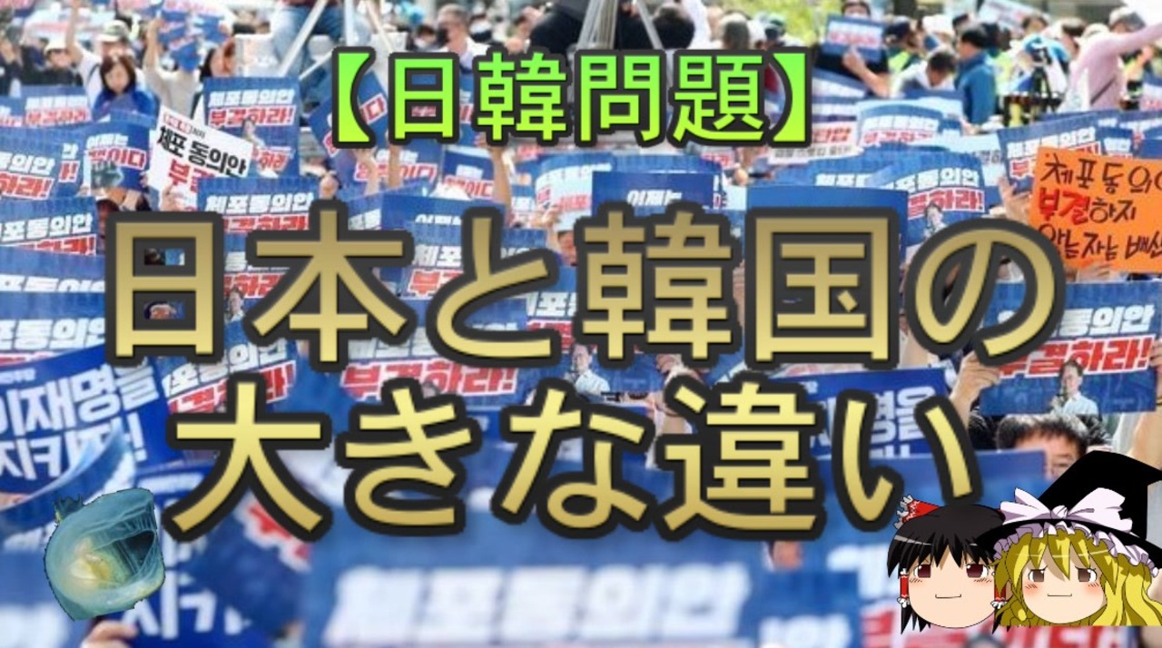 さて、本日は日本と韓国における政治に対する態度の違いについて扱っていきます。<br>どようびはチョコレート味とフルーツ味が人気です<br>本日のブログ記事<br><a href="https://oogchib.hateblo.jp/entry/2024/05/05/210420" target="_blank" rel="noopener nofollow">https://oogchib.hateblo.jp/entry/2024/05/05/210420</a><br><br>元記事<br>日本と韓国の大きな違い<br><a href="https://oogchib.hateblo.jp/entry/2024/04/18/004658" target="_blank" rel="noopener nofollow">https://oogchib.hateblo.jp/entry/2024/04/18/004658</a><br><br>関連動画<br>【日韓問題】日韓で異なる「正しさ」の概念 前編<br><a href="https://www.nicovideo.jp/watch/sm31616028" class="watch">sm31616028</a><br>【日韓問題】韓国人は記憶の改変をしているわけではない?<br><a href="https://www.nicovideo.jp/watch/sm35775418" class="watch">sm35775418</a><br><br>注意<br>・この動画は「日韓の価値観の違い」を扱っています<br><br>・うp主のスタンスは「価値観に善悪や優劣は存在しない」というものです<br><br>・相手が不法を働いているからとこちらが不法をして良い理由にはなりません<br><br>・自身の常識が相手にとっても常識とは限りません、「他者がそれを見たら<br>どう思うか」という客観性を常に持ちましょう。<br><br>・日常生活で注意する程度には言動に注意を心がけてください<br><br>・リクエストは原則受け付けていません<br><br>・引用ソースへのリンクが同時掲載のブログにあります<br><br>・毎週日曜日更新<br><br>引用ソースと動画のテキストをブログ日韓問題(初心者向け)のほうへ掲載しています。<br><br>日韓問題(初心者向け)<br><a href="https://oogchib.hateblo.jp/" target="_blank" rel="noopener nofollow">https://oogchib.hateblo.jp/</a><br><br>暇つぶしにどうぞ<br><a href="http://ooguchib.blog.fc2.com/" target="_blank" rel="noopener nofollow">http://ooguchib.blog.fc2.com/</a> <br><br>twitter @ooguchib<br><a href="https://twitter.com/ooguchib" target="_blank" rel="noopener nofollow">https://twitter.com/ooguchib</a><br><br>前 <a href="https://www.nicovideo.jp/watch/sm43718499" class="watch">sm43718499</a> <a href="https://www.nicovideo.jp/mylist/59069876" target="_blank" rel="noopener">mylist/59069876</a> 次 <a href="https://www.nicovideo.jp/watch/sm43780822" class="watch">sm43780822</a><br><br>番外編マイリスト<br><a href="https://www.nicovideo.jp/mylist/62992608" target="_blank" rel="noopener">mylist/62992608</a><br><br>YouTube版<br><a href="https://youtu.be/Nw6qvVl_CW0" target="_blank" rel="noopener nofollow">https://youtu.be/Nw6qvVl_CW0</a><br>