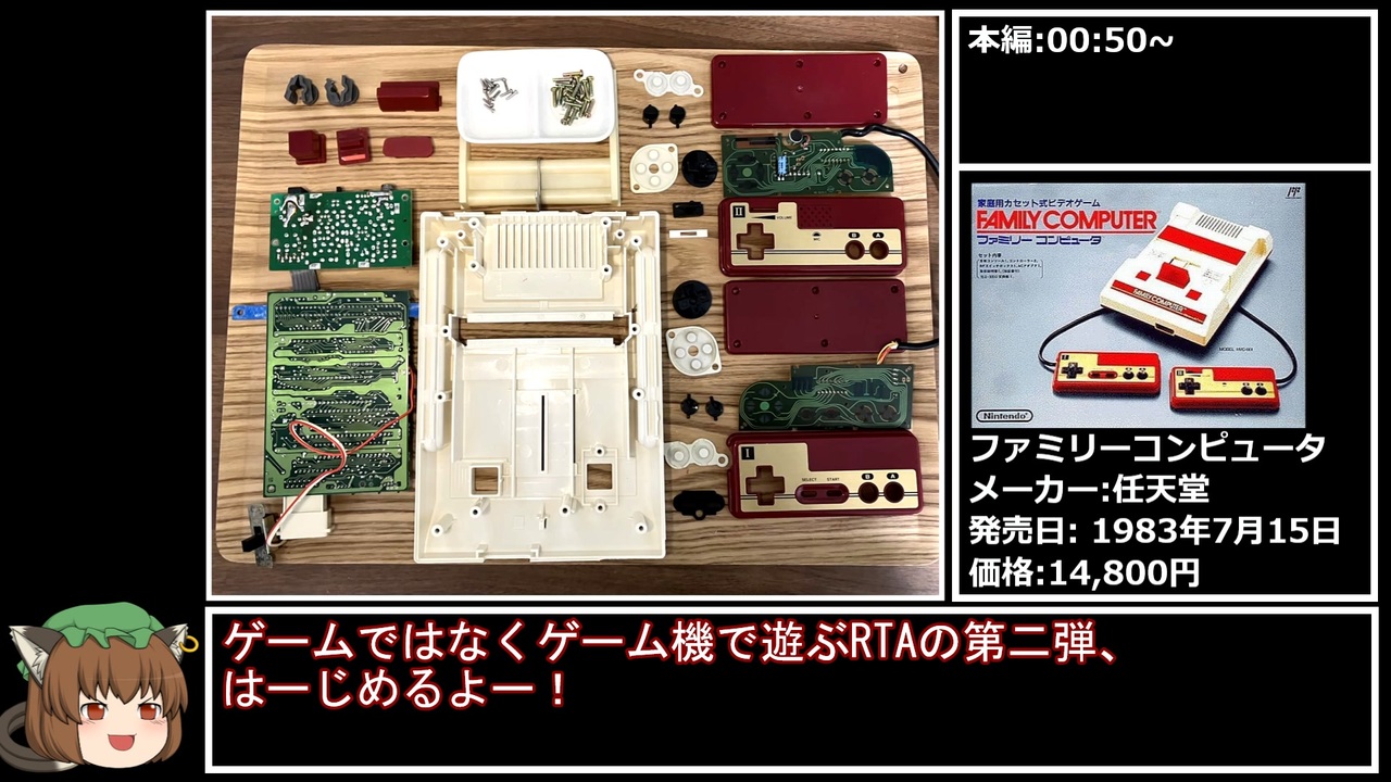 クーソーしてから、寝てください。<br><br>ゲームボーイ編:<a href="https://www.nicovideo.jp/watch/sm42206802" class="watch">sm42206802</a><br><br>レギュレーション<br>・使用機種は初代ファミコン<br>・組み立てる部品の最小単位は手及びドライバーで分解できるところまで<br><br>計測区間<br>開始:部品or工具を触った瞬間<br>終了:組み立て後電源を入れ、電源ランプが付いた瞬間<br><br>RTAまとめ:<a href="https://www.nicovideo.jp/mylist/56827667" target="_blank" rel="noopener">mylist/56827667</a><br>更新報告:<a href="https://twitter.com/yamabukiginu" target="_blank" rel="noopener nofollow">https://twitter.com/yamabukiginu</a><br>RTAinJapan配信想定用動画:<a href="https://www.youtube.com/watch?v=lFkRrQjBrOI" target="_blank" rel="noopener nofollow">https://www.youtube.com/watch?v=lFkRrQjBrOI</a><br><br>追記<br>コメントでも指摘がある通り、<br>コントローラーの向き間違っているため<br>参考記録ということでお願いします...<br><br><a target="_blank" href="https://qa.nicovideo.jp/faq/show/19424?site_domain=default" style="font-size: 13px;color: #657586; text-decoration: underline; line-height: 1.4">この動画は投稿者によって修正されました</a>