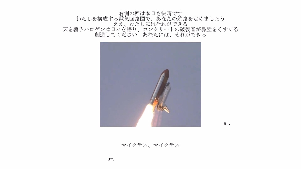 微円です(´・ω・`)<br><br>vocal:知声,浮遊レイ<br><br>poetry reading:足立レイ<br><br>他:微円<br><a href="https://twitter.com/hana_kosho_chu" target="_blank" rel="noopener nofollow">https://twitter.com/hana_kosho_chu</a><br><br>futonさんのぎゃんかわイラストをお借りしました<br>ありがとうございます!!!<br>→<a href="https://piapro.jp/t/b7VH" target="_blank" rel="noopener nofollow">https://piapro.jp/t/b7VH</a><br><br>【歌詞】<br>行為 相違 とっ散らかった<br>もういっそ引っ掛かろうか<br>公理 反り 脳死叶った<br>文字通りカラノウタ<br><br>辿るの 知ること<br>理路<br>謎るの 水どこ?<br>戻<br>宿るの 傷残<br>ってるよのまま とびだすの!<br><br>(a-, a-. マイクテス、マイクテス<br>右側の秤は本日も快晴です<br>わたしを構成する電気回路図で、あなたの航路を定めましょう<br>ええ、わたしにはそれができる<br>天を覆うハロゲンは日々を語り、コンクリートの破裂音が鼻腔をくすぐる<br>創造してください あなたには、それができる)<br><br>行為 相違 とっ散らかった<br>もういっそ引っ掛かろうか<br><br>もしもし もう起きなさった<br>乗り込みたかったのさ<br>もうじきのんびりのんきなあなたが<br>冬眠の隙にパン攫うんだって<br /><br><br><br><br>mylist:<a href="https://www.nicovideo.jp/mylist/75453093" target="_blank" rel="noopener nofollow">https://www.nicovideo.jp/mylist/75453093</a><br><br><a target="_blank" href="https://qa.nicovideo.jp/faq/show/19424?site_domain=default" style="font-size: 13px;color: #657586; text-decoration: underline; line-height: 1.4">この動画は投稿者によって修正されました</a>