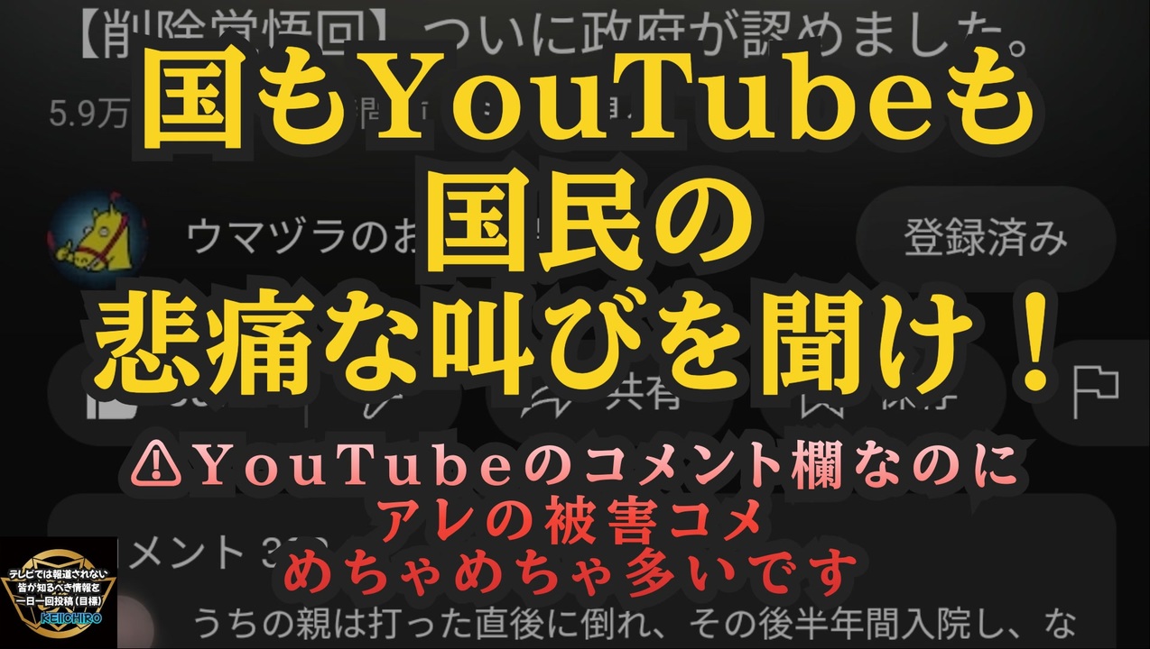 【国もYouTubeも国民の悲痛な叫びを聞け!】<br>YouTubeのコメント欄なのにアレの被害コメントがめちゃめちゃ多い【いつ消されるか分からないので見られるうちに拡散】<br><br>ウマヅラのお茶の間さんの【削除覚悟回】ついに政府が認めました。のコメント欄が悲惨…<br><br>【削除覚悟回】ついに政府が認めました。<br><a href="https://x.gd/joC29" target="_blank" rel="noopener nofollow">https://x.gd/joC29</a><br><br><br>ビルゲイツ財団のワクチン専門家ボッシェ博士が内部告発「世界は全く前例のない人口急減を経験する」<a href="https://twitter.com/TotalWorld1/status/1787673708901077044?t=T0J9ra1Vxr-9N8wX85-b6g&s=19" target="_blank" rel="noopener nofollow">https://twitter.com/TotalWorld1/status/1787673708901077044?t=T0J9ra1Vxr-9N8wX85-b6g&s=19</a><br><br><br>新型コロナウイルス ワクチン ウマヅラビデオ ウマヅラのお茶の間 政府 YouTuber 案件 コロナワクチン ワクチン接種 接種促進 動画 訴求ポイント ワクチン被害 がん 脳梗塞 麻痺 歩行障害 障害 予防接種健康被害救済制度 申請 未申請 ターボがん ワクチン後遺症 削除 検閲 YouTube 削除要請 デマ 誤情報 200万円支出認 める 参政党 神谷宗幣 氷山の一角 2億人打って死んだ数ゼロ はじめしゃちょー デマ太郎 河野太郎 人道に対する罪 戦後最大の大薬害 <br><br><br />著作権、肖像権に配慮して作成しております。<br><br>◆気になったニュースの台本!?<br>メモ代わりに作った台本をそのままあげてます<br><a href="https://keiichiro8140.hatenablog.com/." target="_blank" rel="noopener nofollow">https://keiichiro8140.hatenablog.com/.</a><br><br><br>ここからはシリーズ紹介<br><br><br>◆ ワクチン解毒・デトックス<br><a href="https://x.gd/fZweg" target="_blank" rel="noopener nofollow">https://x.gd/fZweg</a><br><br>◆ウイリアム・マキス博士のがん治療(イベルメクチン・フェンベンダゾール等)<br><a href="https://x.gd/AtFYS" target="_blank" rel="noopener nofollow">https://x.gd/AtFYS</a><br><br>◆予防接種健康被害救済制度<br><a href="https://x.gd/0xK9x" target="_blank" rel="noopener nofollow">https://x.gd/0xK9x</a><br><br>◆気になったニュース #1501~<br><br>◆ 【ショートver】気になったニュース<br><a href="https://x.gd/7MxXC" target="_blank" rel="noopener nofollow">https://x.gd/7MxXC</a><br><br>◆ 気になったニュース #1001~<br><a href="https://x.gd/Lp8gv" target="_blank" rel="noopener nofollow">https://x.gd/Lp8gv</a><br><br>◆ 気になったニュース #501~<br><a href="https://x.gd/EmbS4" target="_blank" rel="noopener nofollow">https://x.gd/EmbS4</a><br><br>◆ 気になったニュース #1~#500<br><a href="https://x.gd/uPhNb" target="_blank" rel="noopener nofollow">https://x.gd/uPhNb</a><br><br>◆ X(旧Twitter)・テレグラムで気になった情報<br><a href="https://x.gd/YG6FT" target="_blank" rel="noopener nofollow">https://x.gd/YG6FT</a><br><br>◆ 日比谷5万人パレードデ⚪生放送アーカイブ動画<br><a href="https://x.gd/3CHJv" target="_blank" rel="noopener nofollow">https://x.gd/3CHJv</a><br><br>◆日比谷5万人パレード⚪モのマイリスト作ってみました<br><a href="https://nico.ms/mylist/76828848?ref=sp_other" target="_blank" rel="noopener nofollow">https://nico.ms/mylist/76828848?ref=sp_other</a><br><br>◆3.30 令和の百姓⚪⚪<br><a href="https://www.nicovideo.jp/series/511791?ref=garage_share_other" target="_blank" rel="noopener nofollow">https://www.nicovideo.jp/series/511791?ref=garage_share_other</a><br><br>◆ 及川幸久さんの【XNEWS】シリーズ<br><a href="https://x.gd/3k78K" target="_blank" rel="noopener nofollow">https://x.gd/3k78K</a><br><br>◆これまでの動画<a href="https://x.gd/sPXoJ" target="_blank" rel="noopener nofollow">https://x.gd/sPXoJ</a><br><br>◆もしも(BAN)の時のためのマイリンク集<a href="https://lit.link/K-16_News44" target="_blank" rel="noopener nofollow">https://lit.link/K-16_News44</a><br><br>