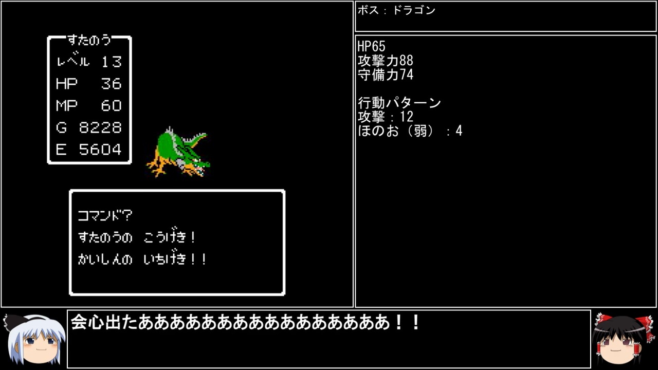 DQⅠの1周目、FCDQⅠ編part2です。<br>会心の一撃ってシステムを考えた人は神だと思う。<br>FC版DQⅠからあって本当に良かった……まあ竜王戦では発動しないんですけどね。<br><br>前→<a href="https://www.nicovideo.jp/watch/sm43708158" class="watch">sm43708158</a><br>次→<a href="https://www.nicovideo.jp/watch/sm43794367" class="watch">sm43794367</a><br><br>YouTube版→<a href="https://youtu.be/8ITCeTqMno4" target="_blank" rel="noopener nofollow">https://youtu.be/8ITCeTqMno4</a><br><br>縛りルール(詳細はpart1参照)<br>①一度使った武器・防具・装飾品・道具・呪文・特技は<br> 次作品以降使用禁止。(売却も解禁扱い)<br><br> 一度使った職業(3,6,7)・仲間モンスター(5,6)・スカウトモンスター(8)は<br> 戦士(Ⅲ)、戦士(Ⅵ)のようにナンバリングで分類し次作品以降使用禁止。<br> また複数体加入できる仲間モンスターは一体まで。<br><br>②裏技、バグ技、全滅、逃走、おどかす禁止。<br> またダンジョン攻略とボス戦における状況再現禁止。<br><br>③ダンジョンとボス攻略は、全キャラのレベルを突入時、<br> 1周目は目標レベル+5。2周目は+10。3周目は+15まで。<br> ラスボスの目標レベルは45。裏ボスは50とする。<br>(目標レベルは各公式ガイドブックを参照)<br><br>④1周目はEDまで。2周目は裏ボス撃破まで。<br> 3周目は全てのボスを規定回数、規定ターン以内に倒す。<br>(回避可能なボスも倒し、闇ゾーマは3周全てで倒す)<br><br><br><span style="color: #262626;">※一部機種は互換機を使用してのプレイとなりますが、倍速機能やクイックセーブ・ロード、チートなどは一切使用しません。</span><br><br>※ネタバレ注意です<br><br>この動画で利用している株式会社スクウェア・エニックスを代表とする共同著作者が権利を所有する著作物及びスギヤマ工房有限会社が権利を所有する楽曲の転載・配布は禁止いたします。<br>(C) ARMOR PROJECT/BIRD STUDIO/SQUARE ENIX All Rights Reserved.<br>(C) SUGIYAMA KOBO (P) SUGIYAMA KOBO<br><br>AquesTalk2ライセンスID:AQTK2WINUSR23122185<br /><br><br>❤いいねを押していただけるとモチベーションと投稿速度が上がるので宜しくお願い致します!<br><br>作者ツイッター→ <a href="https://twitter.com/nig0117" target="_blank" rel="noopener nofollow">https://twitter.com/nig0117</a><br>PIXIV FANBOX→ <a href="https://sutanokeiji.fanbox.cc/" target="_blank" rel="noopener nofollow">https://sutanokeiji.fanbox.cc/</a><br><br>( 以前はWEB小説書いてました→ <a href="https://kakuyomu.jp/works/1177354054884910267" target="_blank" rel="noopener nofollow">https://kakuyomu.jp/works/1177354054884910267</a> )