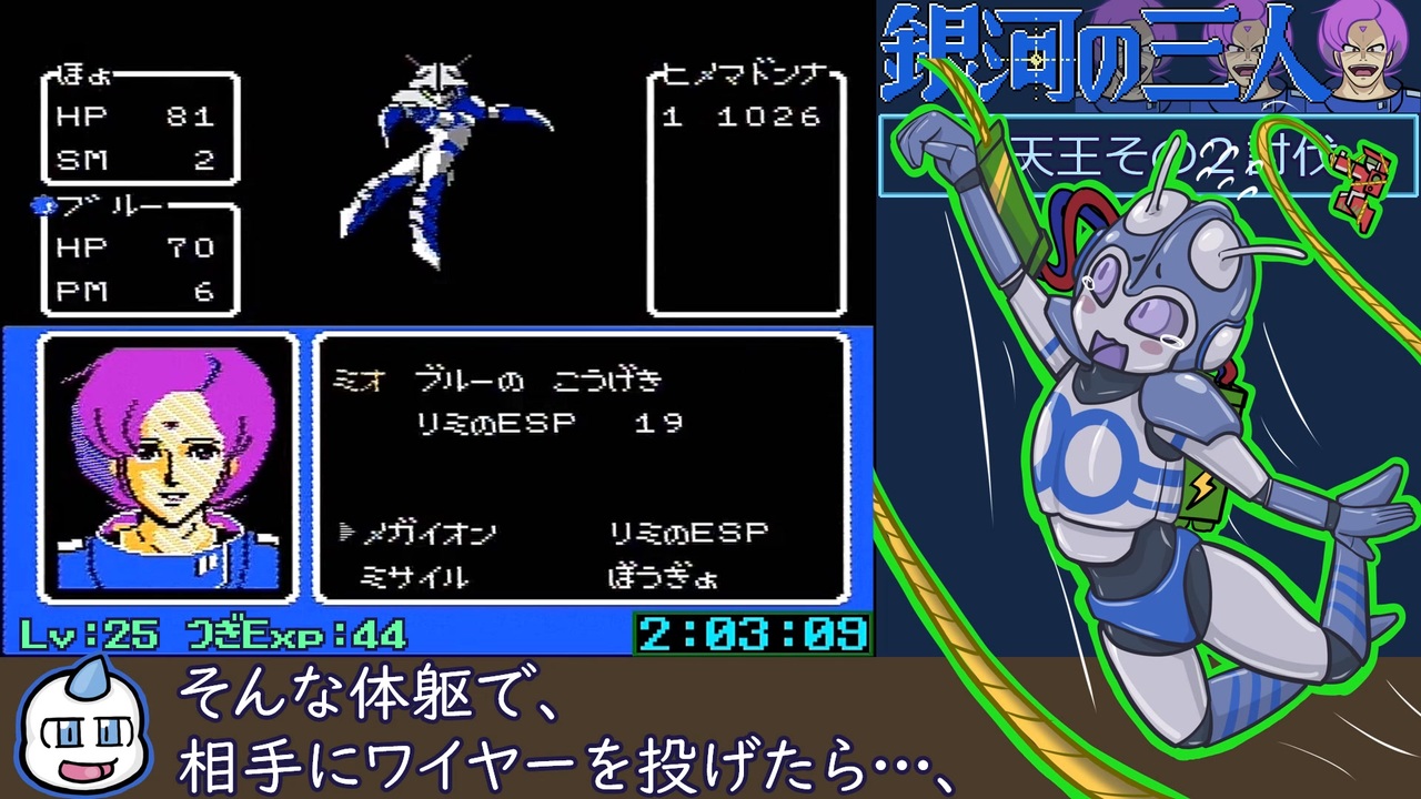 本シリーズ、画面のフラッシュについて<br>注意が不十分だったかも、ごめん。<br>今回は部屋を明るくして見てね。<br>(※次partはフラッシュする時、動画の輝度下げてみます)<br><br>Part4:ヒメマドンナ討伐~ガルム戦艦2破壊<br><br>前:<a href="https://www.nicovideo.jp/watch/sm43730814" class="watch">sm43730814</a> ガルム空母破壊~パディン討伐<br>次:<a href="https://www.nicovideo.jp/watch/sm43815927" class="watch">sm43815927</a> ガルム要塞突入準備~ED<br><br>■動画中でふれたドットフォントのサイトURLはこちら<br><a href="https://hicchicc.github.io/00ff/" target="_blank" rel="noopener nofollow">https://hicchicc.github.io/00ff/</a><br>(ゼロピクセルフリーフォント by 患者長ひっく様)<br><br>レギュレーション<br>・パスワード入手カット【あり】<br>・エンカウント回避技【あり】<br><br>プレイ環境<br>・ニューファミコン<br>・GV-USB2<br><br>『銀河の三人』(c) 1987 Nintendo rights reserved.