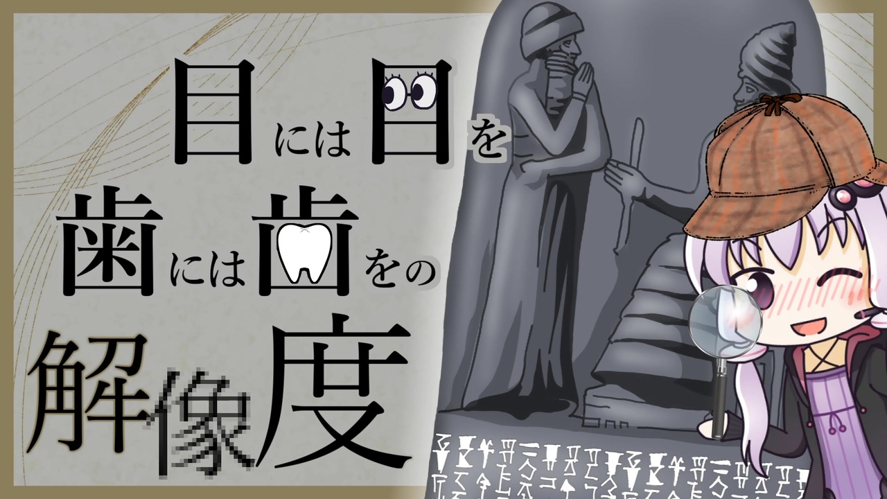 法学専攻の人だったらもっと深い考察できるのかな…うらやま。<br>とか思いながら動画作ってました。<br><br>ハンムラビ法典について、だんだんシリーズ化しつつあるかも。<br>① ハンムラビ法典で知る古代メソポタミアの神:<a href="https://www.nicovideo.jp/watch/sm29386063" class="watch">sm29386063</a> <strong>※全編</strong><br><strong><u>② ハンムラビ法典における暴行事件と金銭賠償:<a href="https://www.nicovideo.jp/watch/sm41533716" class="watch">sm41533716</a> ※09:30~11:20</u></strong><br>③ ハンムラビ法典における金融・投資等の条文:<a href="https://www.nicovideo.jp/watch/sm43461870" class="watch">sm43461870</a> <strong>※全編</strong><br>④ ハンムラビ法典における河川神と裁きの役割:<a href="https://www.nicovideo.jp/watch/sm43571936" class="watch">sm43571936</a> <strong>※00:40~02:22</strong><br>⑤ ハンムラビ法典の "目には目を、歯には歯を":this video.<br><br>【広告宣伝】<br>ジョン失禁王様、ナーガ様、きょうま様、kawasemi様、LY様、taki様、ケスト様、マサ様、<br>丁型海防艦様、大澤伝兵衛様、赤城山登頂記念様、teru様、ちがいます様、Tinkturisto様、<br>huginn様、ゆび様、tado様、aki様、xf108様、nopposan様、tokai200x様、レイナル様、<br>妖怪ヌコスキー様、OrcinusNamaco様、MT様、やみさん様、毒菜様、かるかる♠︎様、丑年様、<br>flag様、kirihuri様、K.A.様、KSI様、あるめい(ある名作ファン)様、fk506様、Miz様、<br>Ælfぎふ様、ゲスト様、汎用人工無能様、foo様、仮名:歴史好きな人様、水陸両用野良ルンバ様、<br>ryu-to-だび様、カマドーマ様、naruk様、やそすけ様、あまや様、瞳の中のシュメール人様、<br>お兄様様、aji様、エンゾ様、lwek92様、aslun様、すり身沢そしお様、hoge様、AMANE1116様、<br>あまや様、クド様、くろすけ様、KOBA様、薬剤耐性様、<br>広告宣伝ありがとうございます(5/19時点)<br><br>【ご案内】<br>・前:メソポタミアご飯:<a href="https://www.nicovideo.jp/watch/sm43648161" class="watch">sm43648161</a><br>・次:-------たぶん、旅。。。<br>・古代メソポタミアマイリスト:<a href="https://www.nicovideo.jp/mylist/40403379" target="_blank" rel="noopener">mylist/40403379</a><br>・たまにメソポタミアの話:<a href="https://mobile.twitter.com/edubba_T" target="_blank" rel="noopener nofollow">https://mobile.twitter.com/edubba_T</a>