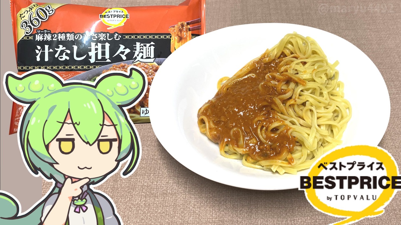 冷凍食品の汁なし担々麺です。<br><br><br>【関連動画】<br>トップバリュの黄色いヤツ「3種の醤で仕上げた旨味楽しむジャージャー麺」<br><a href="https://www.nicovideo.jp/watch/sm43631969" target="_blank" rel="noopener nofollow">https://www.nicovideo.jp/watch/sm43631969</a><br><br>【参考】<br>麻辣2種類の辛さ楽しむ 汁なし担々麺(トップバリュ)<br><a href="https://www.topvalu.net/items/detail/4549414617535/" target="_blank" rel="noopener nofollow">https://www.topvalu.net/items/detail/4549414617535/</a><br>3種の醤で仕上げた旨味楽しむジャージャー麺(トップバリュ)<br><a href="https://www.topvalu.net/items/detail/4549414617542/" target="_blank" rel="noopener nofollow">https://www.topvalu.net/items/detail/4549414617542/</a><br>留学生の願いから始まった奇跡 広島・汁なし担々麺(日本経済新聞 2018.12.29)<br><a href="https://www.nikkei.com/article/DGXKZO39426490X21C18A2KNTP00/" target="_blank" rel="noopener nofollow">https://www.nikkei.com/article/DGXKZO39426490X21C18A2KNTP00/</a><br>汁なし担々麺発祥の店!本場四川省の味が楽しめる<br>「きさく」|広島市中区(ひろしまリード 2023.06.15)<br><a href="https://hread.home-tv.co.jp/post-279681/" target="_blank" rel="noopener nofollow">https://hread.home-tv.co.jp/post-279681/</a><br><br>【使用した素材】(※敬称略)<br>(合成音声)VOICEVOX/ずんだもん/四国めたん<br><a href="https://voicevox.hiroshiba.jp/" target="_blank" rel="noopener nofollow">https://voicevox.hiroshiba.jp/</a><br>(立ち絵)坂本アヒル<br><a href="https://seiga.nicovideo.jp/seiga/im10788496" target="_blank" rel="noopener">im10788496</a>/<a href="https://seiga.nicovideo.jp/seiga/im10791276" target="_blank" rel="noopener">im10791276</a><br>(楽曲)甘茶の音楽工房/「楽しい麦畑」「フルーツパフェ」「お城の舞踏会」<br><a href="https://amachamusic.chagasi.com/" target="_blank" rel="noopener nofollow">https://amachamusic.chagasi.com/</a>