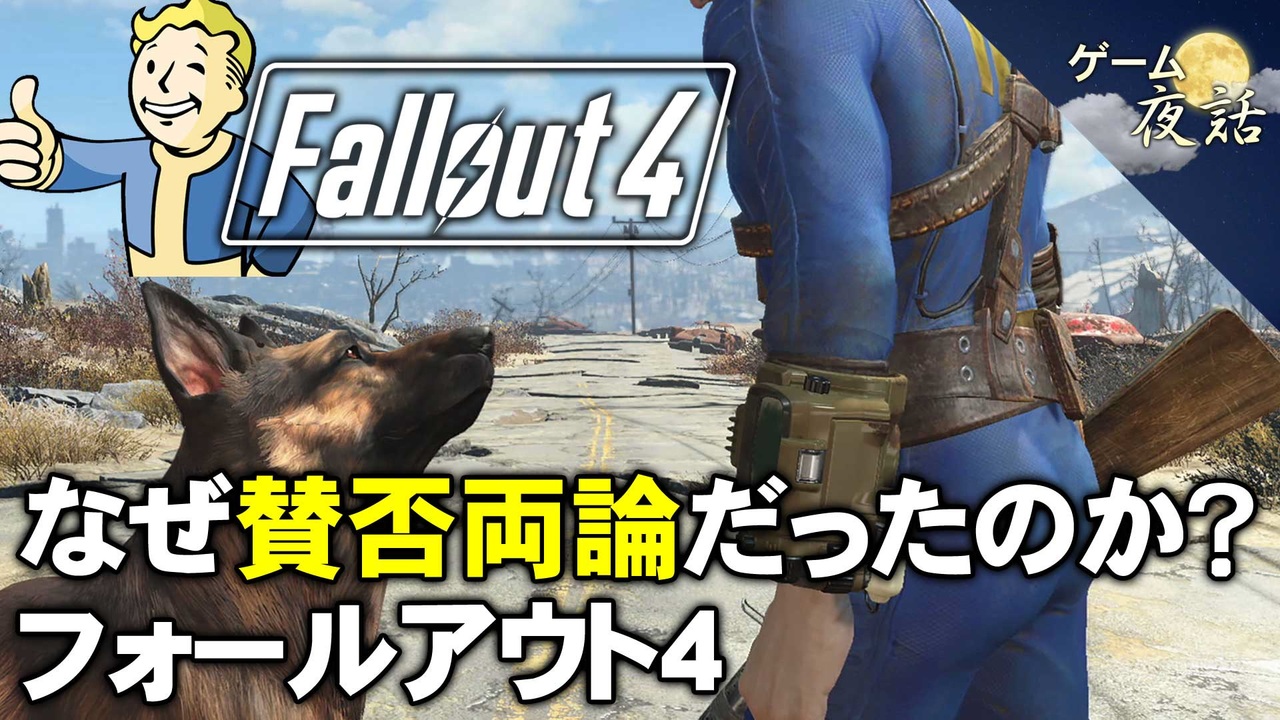 前回の動画にギフト・ニコニ広告して下さった方、ありがとうございました。<br>原則、「前編」「後編」合わせて毎回約30分を予定しています。<br><br><strong>▼第171回「Fallout4」</strong><br>発売当初は、ファンの間で賛否がわかれる評価でした。その要因について解説しています。<br><br><strong>▼ゲーム夜話マイリスト</strong><br><a href="https://www.nicovideo.jp/mylist/56973971" target="_blank" rel="noopener nofollow">https://www.nicovideo.jp/mylist/56973971</a><br><br><strong>▼関連動画</strong><br>■「Fallout3」の考察動画<br>前編:<a href="https://www.nicovideo.jp/watch/sm32274619" class="watch">sm32274619</a><br>後編:<a href="https://www.nicovideo.jp/watch/sm32303536" class="watch">sm32303536</a><br><br>■「The Elder Scrolls V:スカイリム」の考察動画<br>前編:<a href="https://www.nicovideo.jp/watch/sm35626141" class="watch">sm35626141</a><br>後編:<a href="https://www.nicovideo.jp/watch/sm35669014" class="watch">sm35669014</a><br><br>■youtubeはこちら <a href="https://youtu.be/AOM3rU3VvoE" target="_blank" rel="noopener nofollow">https://youtu.be/AOM3rU3VvoE</a><br>■ゲーム夜話「X(旧:ツイッター」<a href="https://twitter.com/gameyawa" target="_blank" rel="noopener nofollow">https://twitter.com/gameyawa</a>