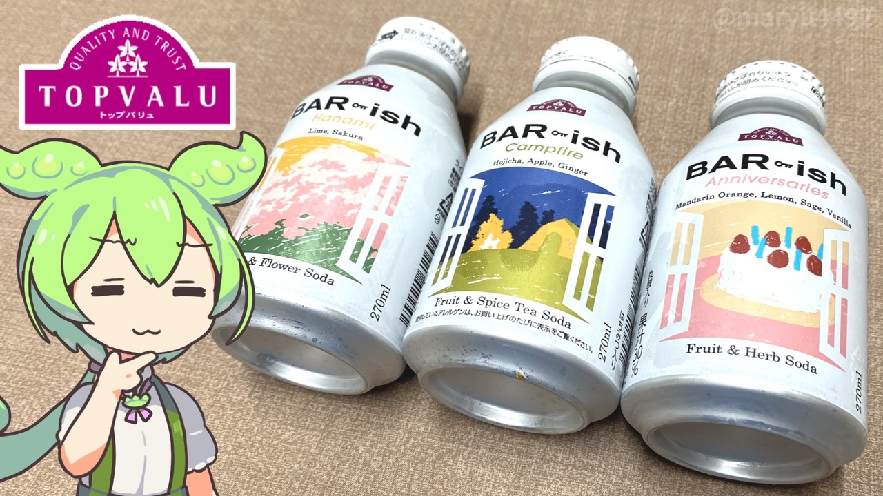 新感覚ドリンク「クラフテル」というシリーズから<br>BAR-ish(バーリッシュ)という商品が登場しました。<br>どうやら様々なシーンに合わせた飲み物ということですが<br>味はどうでしょうか。<br><br><br>【関連動画】<br>トップバリュの赤いヤツ「クラフトコーラとジンジャーエール」<br><a href="https://www.nicovideo.jp/watch/sm43335306" target="_blank" rel="noopener nofollow">https://www.nicovideo.jp/watch/sm43335306</a><br><br>【参考】<br>バーリッシュ(トップバリュ)<br><a href="https://www.topvalu.net/tv-craftail-barish/" target="_blank" rel="noopener nofollow">https://www.topvalu.net/tv-craftail-barish/</a><br>BAR-ish Hanami Lime,Sakura(トップバリュ)<br><a href="https://www.topvalu.net/items/detail/4549414611694/" target="_blank" rel="noopener nofollow">https://www.topvalu.net/items/detail/4549414611694/</a><br>BAR-ish Campfire Hojicha,Apple,Ginger(トップバリュ)<br><a href="https://www.topvalu.net/items/detail/4549414611755/" target="_blank" rel="noopener nofollow">https://www.topvalu.net/items/detail/4549414611755/</a><br>BAR-ish Anniversaries Mandarin Orange,Lemon,Sage,Vanilla(トップバリュ)<br><a href="https://www.topvalu.net/items/detail/4549414611762/" target="_blank" rel="noopener nofollow">https://www.topvalu.net/items/detail/4549414611762/</a><br><br>【使用した素材】(※敬称略)<br>(合成音声)VOICEVOX/ずんだもん/四国めたん<br><a href="https://voicevox.hiroshiba.jp/" target="_blank" rel="noopener nofollow">https://voicevox.hiroshiba.jp/</a><br>(立ち絵)坂本アヒル<br><a href="https://seiga.nicovideo.jp/seiga/im10788496" target="_blank" rel="noopener">im10788496</a>/<a href="https://seiga.nicovideo.jp/seiga/im10791276" target="_blank" rel="noopener">im10791276</a><br>(楽曲)甘茶の音楽工房/「楽しい麦畑」「フルーツパフェ」「お城の舞踏会」<br><a href="https://amachamusic.chagasi.com/" target="_blank" rel="noopener nofollow">https://amachamusic.chagasi.com/</a>