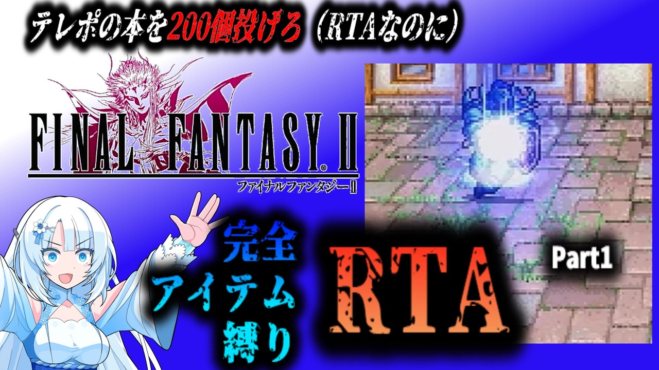 ピクセルリマスター版FF2(Switch版)を以下の条件でRTAしました。<br><br>・戦闘中に許可するコマンドは「アイテム」「ぼうぎょ」のみ<br>・移動中の魔法利用禁止<br>・操作ガバ等で縛り違反をした場合は、すぐに直前のセーブデータからやり直す<br>・ブースト機能の利用を一部許可(エンカウントOFF・獲得ギル4倍を利用)<br>・計測区間は名前を決定してから、ウボァーのセリフが表示された瞬間まで<br>・苦行はしない<br><br>本動画は「ゲームやりこみ学会 新作動画発表会2024春」へ参加しています。<br><br>まるで成長しないFF2RTAと平行して投稿しています。→<a href="https://www.nicovideo.jp/series/474962" target="_blank" rel="noopener">series/474962</a><br>VOICEVOX:WhiteCUL<br><br>参考サイト……<br>ファイナルファンタジー用語辞典:<a href="https://wikiwiki.jp/ffdic" target="_blank" rel="noopener nofollow">https://wikiwiki.jp/ffdic</a><br>GCGX(ゲーム攻略・解析&ホームページ作成):<a href="https://gcgx.games/" target="_blank" rel="noopener nofollow">https://gcgx.games/</a><br>FF2よ永遠なれ:<a href="https://surume5.han-be.com/Home/FF2/index.htm" target="_blank" rel="noopener nofollow">https://surume5.han-be.com/Home/FF2/index.htm</a><br>Gamer Corner Guides:<a href="https://guides.gamercorner.net/" target="_blank" rel="noopener nofollow">https://guides.gamercorner.net/</a><br>はたぼーの部屋:<a href="https://hboh2511.web.fc2.com/" target="_blank" rel="noopener nofollow">https://hboh2511.web.fc2.com/</a><br>cheapなゲーム攻略情報:<a href="http://www.ric.hi-ho.ne.jp/cheap_restaurant/GAME/" target="_blank" rel="noopener nofollow">http://www.ric.hi-ho.ne.jp/cheap_restaurant/GAME/</a><br>まるで成長しないFF2_RTA エンカOFF・ギル/熟練度/能力値0倍縛り:<a href="https://www.nicovideo.jp/series/459507" target="_blank" rel="noopener">series/459507</a><br><br>Part2→<a href="https://www.nicovideo.jp/watch/sm43857459" class="watch">sm43857459</a><br><br>© SQUARE ENIX<br>LOGO ILLUSTRATION:© YOSHITAKA AMANO<br>「記載されている会社名・製品名・システム名などは、各社の商標、または登録商標です。」