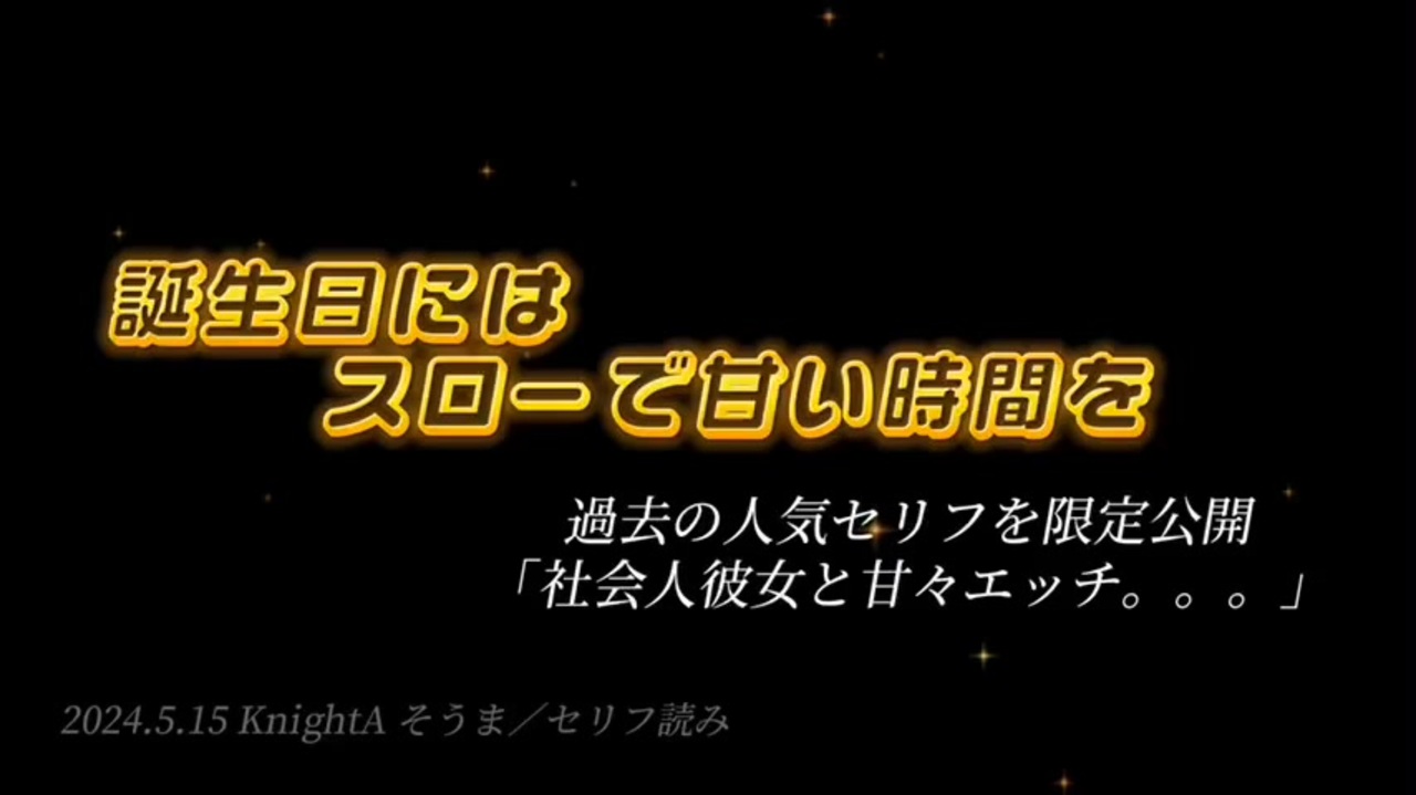 【題名】<br>誕生日にはスローで甘い時間を ※R18<br>【あらすじ】<br>彼女の誕生日に休みを合わせて取った2人<br>急遽、彼女が休日出勤になってしまいます<br>デートが出来なくなってしまったと彼女は落ち込み..<br>仕事から疲れて帰って来た彼女へ、甘くとろけるような時間をと考えた彼氏は...<br><br>体位:正常位→バック→松葉崩し<br><br>(pixiv)オリジナル台本/ 郁美-あやみ- 様<br>・Xアカウント(@ayami_serihu)<br><br><br>(2024/5/15配信で読まれた台本です)<br>そうまくんツイキャス/ASMR専<br><a href="https://twitcasting.tv/c:soma_voice0310" target="_blank" rel="noopener nofollow">https://twitcasting.tv/c:soma_voice0310</a><br><br>そうまくんXアカウント<br>@soma_voice <br>@so_ma_spiii <br>