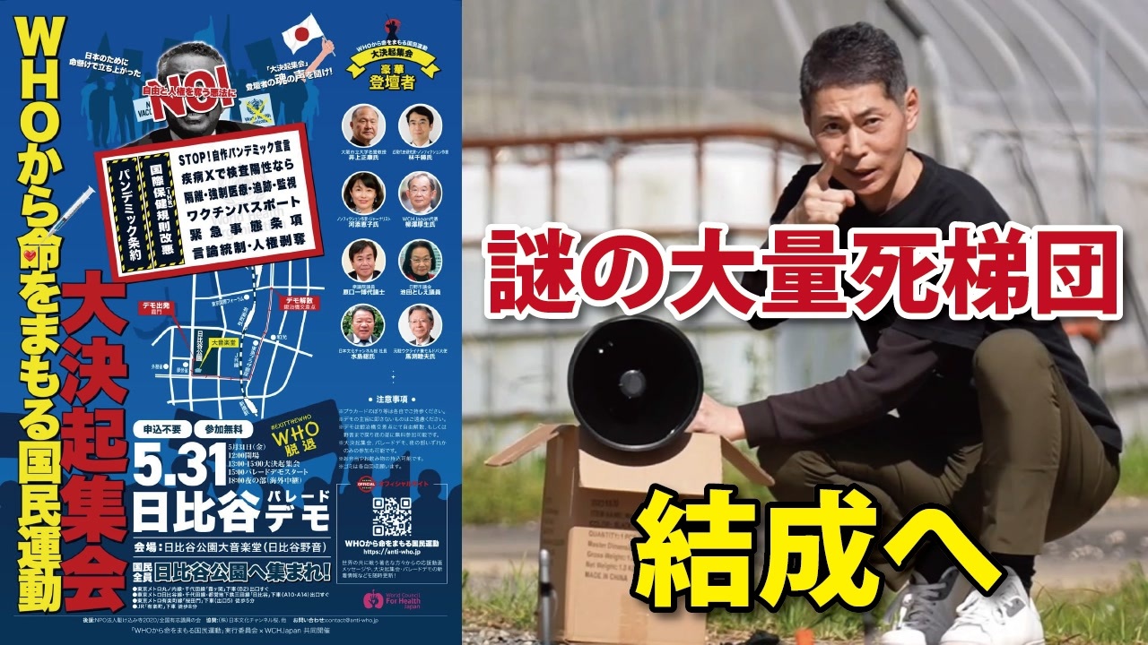 ❑事前調査アンケートはこちら<br><a href="https://docs.google.com/forms/d/e/1FAIpQLScScCilry43m4App916fRfpsH4_56GGXLwcPr1cN7UHDoPpJQ/viewform" target="_blank" rel="noopener nofollow">https://docs.google.com/forms/d/e/1FAIpQLScScCilry43m4App916fRfpsH4_56GGXLwcPr1cN7UHDoPpJQ/viewform</a><br><br>❑Tシャツのネット販売はこちら<br><a href="https://saitamassbk.base.shop/items/74757740" target="_blank" rel="noopener nofollow">https://saitamassbk.base.shop/items/74757740</a><br><br>❑ザ!世界仰天ニュース<br> 信じた薬でHIV感染!薬害エイズ事件…700人超死亡の恐怖<br> <a href="https://tver.jp/episodes/epa46rxys6?p=2000" target="_blank" rel="noopener nofollow">https://tver.jp/episodes/epa46rxys6?p=2000</a><br> ※5月21日20:59まで視聴できます。<br><br>❑パレードデモの詳細はこちら(WHOから命をまもる国民運動)<br><a href="https://anti-who.jp/" target="_blank" rel="noopener nofollow">https://anti-who.jp/</a><br><br>―――――――――――――――――――――――――――――――<br><br>❑「世界を欺いた〇〇〇〇〇〇〇」(宝島社新書)<br><a href="https://amzn.to/3ymDfgr" target="_blank" rel="noopener nofollow">https://amzn.to/3ymDfgr</a><br>鳥集徹(著) 闇のダディ(著) 藤江成光(著)←私<br><br>―――――――――――――――――――――――――――――――<br><br>❑藤江の「真の」日本人増加計画(ニコニコチャンネル+)<br><a href="https://nicochannel.jp/fujie/" target="_blank" rel="noopener nofollow">https://nicochannel.jp/fujie/</a><br>※毎月第3土曜日の夜、定例ライブ配信!<br><br><br>❏藤江の活動を支援していただける方向け<br>【藤江支援口座】のご案内<br>住信SBIネット銀行 ミカン支店(店番号103)<br>口座番号 3107694<br>口座名義 フジエ マサミツ<br><br>――――――――――――――――――――――――――――――<br><br>地域と日本の存続のためニ!【藤江2ndチャンネル】<br><a href="https://www.youtube.com/channel/UCfBh4rv5UT7D-qR6KsoZrsA" target="_blank" rel="noopener nofollow">https://www.youtube.com/channel/UCfBh4rv5UT7D-qR6KsoZrsA</a><br><br>今こそ!三千年の底力【藤江3rdチャンネル】<br><a href="https://www.youtube.com/channel/UC5Yrsm8-X8nZj4uKgvE7CBw" target="_blank" rel="noopener nofollow">https://www.youtube.com/channel/UC5Yrsm8-X8nZj4uKgvE7CBw</a><br><br>四海兄弟【藤江4thチャンネル】<br><a href="https://www.youtube.com/channel/UCiyJNO57quj80Ysy7nOABvA" target="_blank" rel="noopener nofollow">https://www.youtube.com/channel/UCiyJNO57quj80Ysy7nOABvA</a><br><br>五穀豊穣【藤江5thチャンネル】<br><a href="https://www.youtube.com/channel/UCptMJCoKYghfew5tDzoEqHQ" target="_blank" rel="noopener nofollow">https://www.youtube.com/channel/UCptMJCoKYghfew5tDzoEqHQ</a><br><br>藤江のX(Twitter)<br><a href="https://twitter.com/JINKOUZOUKA_jp" target="_blank" rel="noopener nofollow">https://twitter.com/JINKOUZOUKA_jp</a>