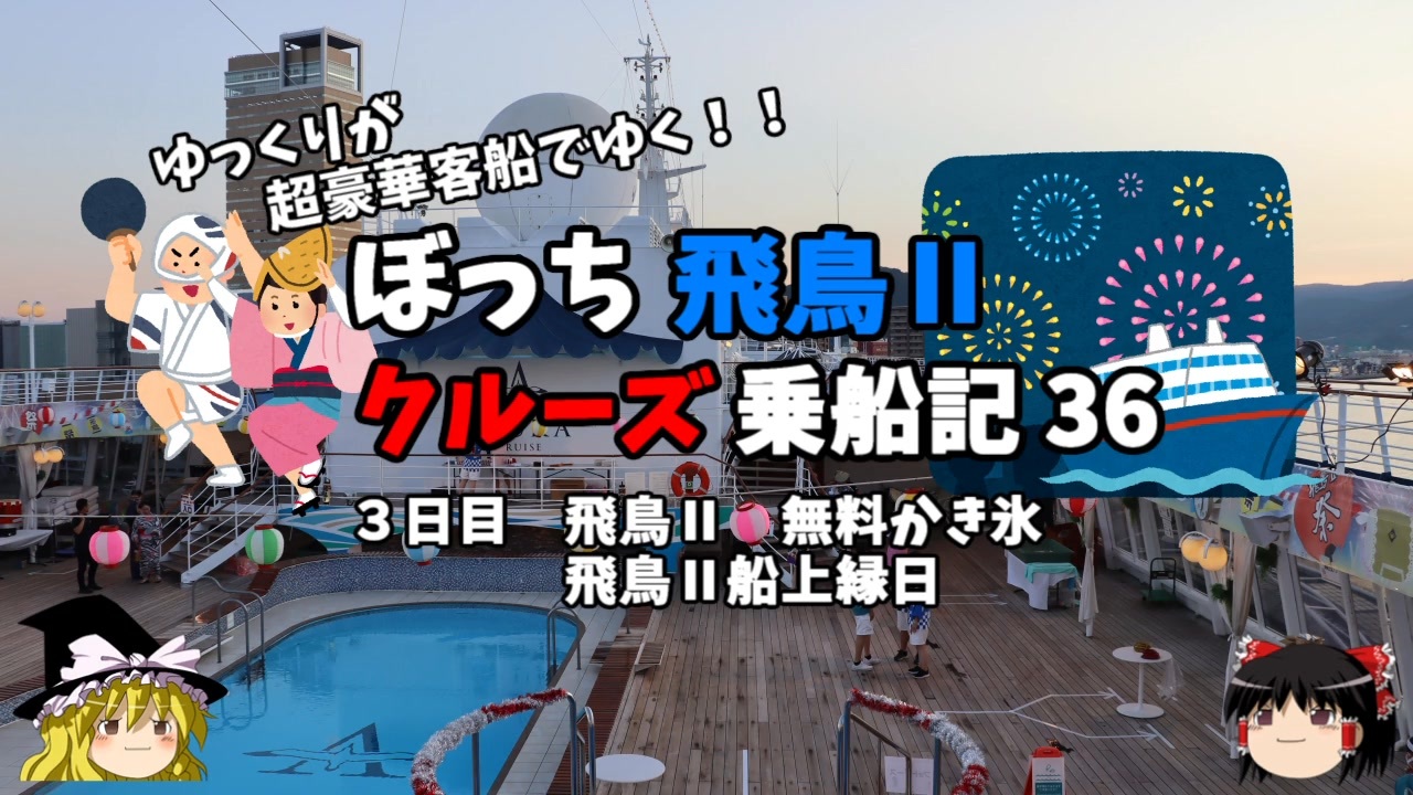 <span style="color: #ff0000; font-size: medium;"><u>※Youtubeで1話分、先行配信中 </u></span><br><span style="color: #0000ff; font-size: medium;"> <a href="http://www.youtube.com/c/なめこのぼっち旅" target="_blank" rel="noopener nofollow">http://www.youtube.com/c/なめこのぼっち旅</a></span><br><br><br>2023年の盆休みに飛鳥Ⅱに乗船してきたした!<br>その模様をお伝えします!<br><br><span style="color: #ff0000;">コミュニティー→co2910020</span><br><br>twitter→<a href="https://twitter.com/ryontan" target="_blank" rel="noopener nofollow">https://twitter.com/ryontan</a><br><br><a href="https://www.nicovideo.jp/watch/sm43768685" class="watch">sm43768685</a>← 前回 <span style="color: #ff0000;">次回 → </span><a href="https://www.nicovideo.jp/watch/sm43817625" class="watch">sm43817625</a><br><br>今作 飛鳥Ⅱクルーズ乗船記→<a href="https://www.nicovideo.jp/mylist/75717836" target="_blank" rel="noopener">mylist/75717836</a><br>前作 北海道車中泊旅行記→<a href="https://www.nicovideo.jp/mylist/73483035" target="_blank" rel="noopener">mylist/73483035</a><br>モルディブ旅行記→<a href="https://www.nicovideo.jp/mylist/72339602" target="_blank" rel="noopener">mylist/72339602</a><br>東欧旅行記→<a href="https://www.nicovideo.jp/mylist/70339665" target="_blank" rel="noopener">mylist/70339665</a><br>解説・雑談系→<a href="https://www.nicovideo.jp/mylist/63171869" target="_blank" rel="noopener">mylist/63171869</a><br>スイス旅行記<span style="color: #000000; font-size: 14px;">→</span><a href="https://www.nicovideo.jp/mylist/68347869" target="_blank" rel="noopener">mylist/68347869</a><br>スペイン周遊記→<a href="https://www.nicovideo.jp/mylist/64537827" target="_blank" rel="noopener">mylist/64537827</a><br>韓国トルコ旅行記→<a href="https://www.nicovideo.jp/mylist/63654428" target="_blank" rel="noopener">mylist/63654428</a><br>車中泊旅行記→<a href="https://www.nicovideo.jp/mylist/54706524" target="_blank" rel="noopener">mylist/54706524</a><br>久米島(沖縄)旅行記→<a href="https://www.nicovideo.jp/mylist/63059251" target="_blank" rel="noopener">mylist/63059251</a><br>イギリスタイ旅行記→<a href="https://www.nicovideo.jp/mylist/60044833" target="_blank" rel="noopener">mylist/60044833</a><br>クルーズ旅行記→<a href="https://www.nicovideo.jp/mylist/57397685" target="_blank" rel="noopener">mylist/57397685</a><br>ドイツ周遊記→<a href="https://www.nicovideo.jp/mylist/54938346" target="_blank" rel="noopener">mylist/54938346</a><br>北海道旅行記→<a href="https://www.nicovideo.jp/mylist/52618057" target="_blank" rel="noopener">mylist/52618057</a><br>アメリカ横断記→<a href="https://www.nicovideo.jp/mylist/48621785" target="_blank" rel="noopener">mylist/48621785</a><br>イタリア周遊記→<a href="https://www.nicovideo.jp/mylist/45763559" target="_blank" rel="noopener">mylist/45763559</a><br>NY旅行記→<a href="https://www.nicovideo.jp/mylist/44343854" target="_blank" rel="noopener">mylist/44343854</a>
