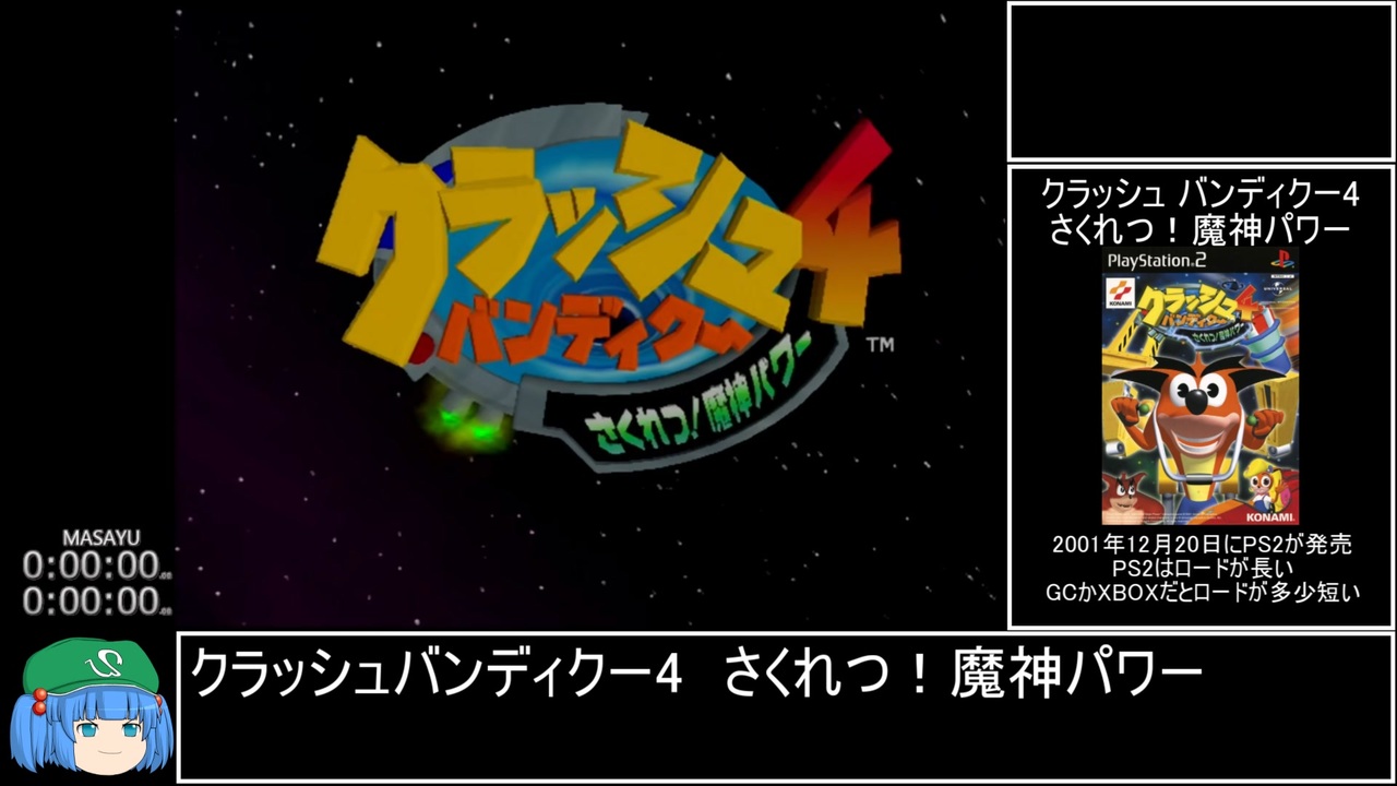 PS2のRTAは初めてなので初投稿です<br>水の魔人エリア前半まで<br><br>次→<a href="https://www.nicovideo.jp/watch/sm43832268" class="watch">sm43832268</a><br>投稿動画→<a href="https://www.nicovideo.jp/mylist/44129502" target="_blank" rel="noopener">mylist/44129502</a><br><br>無編集→<a href="https://youtu.be/xijPmo2j1Do?si=OKHI_wS4vz7blCrn" target="_blank" rel="noopener nofollow">https://youtu.be/xijPmo2j1Do?si=OKHI_wS4vz7blCrn</a><br><br>使用機種「PS2」<br>レギュレーション<br>・操作可能になってから~106%達成してラスボスを撃破まで<br>・ロードを含めない時間が記録になります(上のタイマー)<br> Load Removed Time :2時間32分56秒<br> Real Time :3時間24分38秒<br><br>マルチバース→<a href="https://www.nicovideo.jp/watch/sm39988167" class="watch">sm39988167</a><br>カーニバル →<a href="https://www.nicovideo.jp/watch/sm42854258" class="watch">sm42854258</a><br><br>X→<a href="https://x.com/masayu_345" target="_blank" rel="noopener nofollow">https://x.com/masayu_345</a>