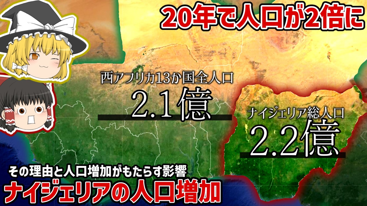 <span style="font-size: 18px;"><strong>ナイジェリア</strong></span><br><strong>2000年</strong>には<strong>日本と同じ1.2億人</strong>ほどの人口だったアフリカの国です。<br>しかし<strong>2023年</strong>には<strong>2.2億人</strong>、以前の<span style="font-size: 16px;">2倍</span>にまで人口が増えることとなりました。<br>これは西アフリカ諸国の人口を一国で凌駕する規模です。<br><br>そんなナイジェリアの人口増加の要因とそれがもたらす影響について解説してみました!<br>タイトルの憶を億に修正(5/20)<br><br>◆マイリスト→<a href="https://www.nicovideo.jp/mylist/73354161" target="_blank" rel="noopener nofollow">https://www.nicovideo.jp/mylist/73354161</a><br>◆アフリカの情報を上げてるうぷ主のTwitter→<a href="https://twitter.com/AfrikaanerMaris" target="_blank" rel="noopener nofollow">https://twitter.com/AfrikaanerMaris</a><br><br>いいねくれるとうれしいです<br>いっぱいコメントしてくれるとうぷ主が喜びます。<br>