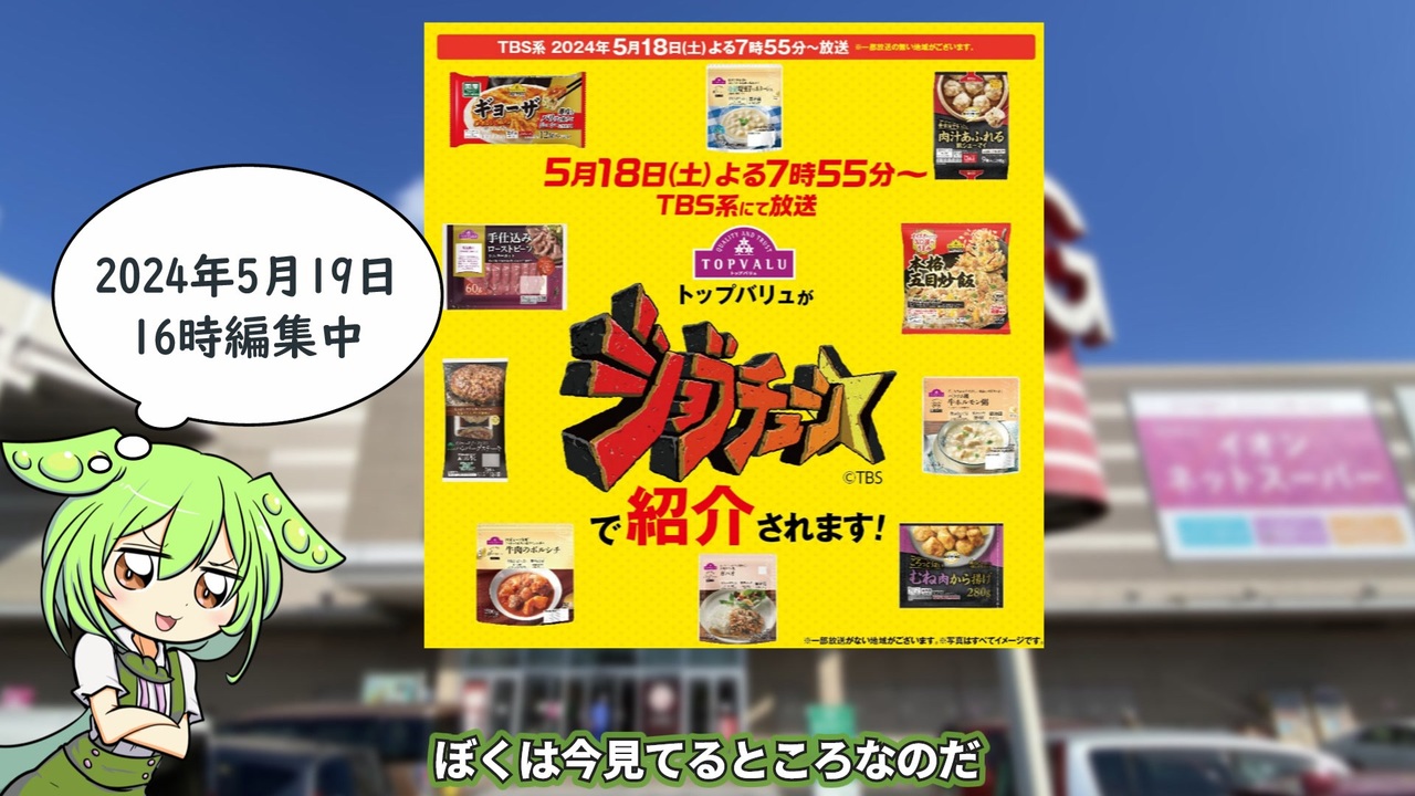 2024.05.18にTBS系列で放送された「ジョブチューン」で<br>トップバリュが紹介されました。<br>今回はその感想と以前紹介した冷凍シューマイの動画をコメント付きで紹介します。<br><br><br>【関連動画】<br>トップバリュの黄色いヤツで作る『特製晩酌セット』(※冷凍しゅうまい)<br><a href="https://www.nicovideo.jp/watch/sm41927682" target="_blank" rel="noopener nofollow">https://www.nicovideo.jp/watch/sm41927682</a><br>トップバリュの黄色いヤツ「本格五目炒飯」<br><a href="https://www.nicovideo.jp/watch/sm42237719" target="_blank" rel="noopener nofollow">https://www.nicovideo.jp/watch/sm42237719</a><br>トップバリュの黄色いヤツ「羽根ができる冷凍ギョーザ」<br><a href="https://www.nicovideo.jp/watch/sm42864025" target="_blank" rel="noopener nofollow">https://www.nicovideo.jp/watch/sm42864025</a><br>トップバリュの緑のヤツ「タスマニアビーフ100%ハンバーグステーキ」<br><a href="https://www.nicovideo.jp/watch/sm43782033" target="_blank" rel="noopener nofollow">https://www.nicovideo.jp/watch/sm43782033</a><br><br>【参考】<br>ジョブチューン(TBS)<br><a href="https://www.tbs.co.jp/jobtune/" target="_blank" rel="noopener nofollow">https://www.tbs.co.jp/jobtune/</a><br>ジョブチューン公式X<br><a href="https://x.com/jobtune_TBS" target="_blank" rel="noopener nofollow">https://x.com/jobtune_TBS</a><br>肉汁あふれる豚シューマイ(トップバリュ)<br><a href="https://www.topvalu.net/items/detail/4549414577150/" target="_blank" rel="noopener nofollow">https://www.topvalu.net/items/detail/4549414577150/</a><br>トップバリュがジョブチューンで紹介されました(トップバリュ)<br><a href="https://www.topvalu.net/jobtune/" target="_blank" rel="noopener nofollow">https://www.topvalu.net/jobtune/</a><br><br>【使用した素材】(※敬称略)<br>(合成音声)VOICEVOX/ずんだもん/四国めたん<br><a href="https://voicevox.hiroshiba.jp/" target="_blank" rel="noopener nofollow">https://voicevox.hiroshiba.jp/</a><br>(立ち絵)坂本アヒル<br><a href="https://seiga.nicovideo.jp/seiga/im10788496" target="_blank" rel="noopener">im10788496</a>/<a href="https://seiga.nicovideo.jp/seiga/im10791276" target="_blank" rel="noopener">im10791276</a><br>(立ち絵2)おがりや<br><a href="https://seiga.nicovideo.jp/seiga/im11135221?track=seiga_illust_keyword" target="_blank" rel="noopener nofollow">https://seiga.nicovideo.jp/seiga/im11135221?track=seiga_illust_keyword</a><br>(楽曲)甘茶の音楽工房/「楽しい麦畑」「フルーツパフェ」「お城の舞踏会」「月明りの庭園」<br><a href="https://amachamusic.chagasi.com/" target="_blank" rel="noopener nofollow">https://amachamusic.chagasi.com/</a>