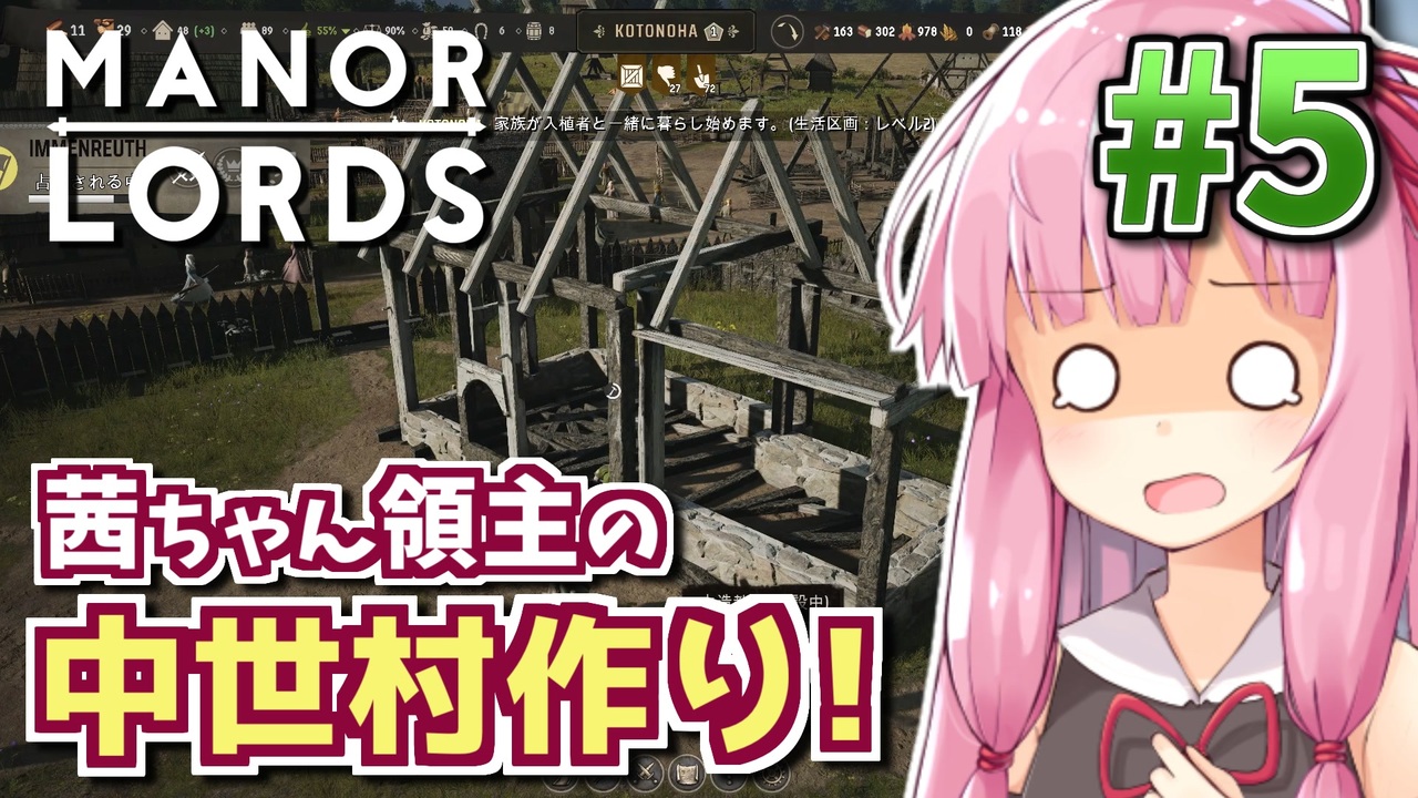 「ぼくのかんがえた最強のBanished」こと、中世ヨーロッパの封建領主になって自由に村づくりできるゲーム「Manor Lords (マナーロード)」。<br>領主・琴葉 茜と自称軍師・結月ゆかりがプレイします!<br>未プレイ向けの丁寧な解説を加えてるのでプレイ済みの方々はご了承ください。<br><br>第5話は隣国との領地争いを解決し、焼かれた村を復興させます。<br><br>前 : (<a href="https://www.nicovideo.jp/watch/sm43718892" class="watch">sm43718892</a>) <-> 次 : (<a href="https://www.nicovideo.jp/watch/sm43977784" class="watch">sm43977784</a>)<br>このシリーズのリンク: <a href="https://www.nicovideo.jp/series/468306" target="_blank" rel="noopener">series/468306</a><br><br>■ プレイ環境: Manor Lords (Early Access 0.7.995) Corei5 13600k + RTX4080 <br> アーリーアクセス版ゆえ一部翻訳・仕様が開発中なところがあります。ご注意ください。<br>■ プレイ設定: 一触即発シナリオ 難易度ノーマル・隣接領主あり・盗賊多め<br />HoI4プレイ講座 → (<a href="https://www.nicovideo.jp/mylist/62136132" target="_blank" rel="noopener">mylist/62136132</a>)<br>EU4プレイ講座→(<a href="https://www.nicovideo.jp/mylist/61049948" target="_blank" rel="noopener">mylist/61049948</a>)<br>CK3プレイ講座→(<a href="https://www.nicovideo.jp/series/191974" target="_blank" rel="noopener">series/191974</a>)<br>Stellarisプレイ講座→(<a href="https://www.nicovideo.jp/series/263583" target="_blank" rel="noopener">series/263583</a>)<br>Vic3プレイ講座→(<a href="https://www.nicovideo.jp/series/364690" target="_blank" rel="noopener">series/364690</a>)<br>赤いシムシティ実況動画 → (<a href="https://www.nicovideo.jp/series/8074" target="_blank" rel="noopener">series/8074</a>)<br>太閤立志伝5 DX実況動画→ (<a href="https://www.nicovideo.jp/series/323444" target="_blank" rel="noopener">series/323444</a>)<br>信長の野望 小田家プレイ動画 → (<a href="https://www.nicovideo.jp/series/353641" target="_blank" rel="noopener">series/353641</a>)<br>紲星あかりF1参戦記→(<a href="https://www.nicovideo.jp/series/222744" target="_blank" rel="noopener">series/222744</a>)<br>あかねとあかりのソビエト国境警備隊!→ (<a href="https://www.nicovideo.jp/series/394983" target="_blank" rel="noopener">series/394983</a>)<br>Cities: Skylines2都市開発プレイ動画 → (<a href="https://www.nicovideo.jp/series/436779" target="_blank" rel="noopener">series/436779</a>)<br>Manor Lords村作りプレイ動画 → (<a href="https://www.nicovideo.jp/series/468306" target="_blank" rel="noopener">series/468306</a>)<br>全動画投稿リスト (<a href="https://www.nicovideo.jp/user/77964272" target="_blank" rel="noopener">user/77964272</a>)