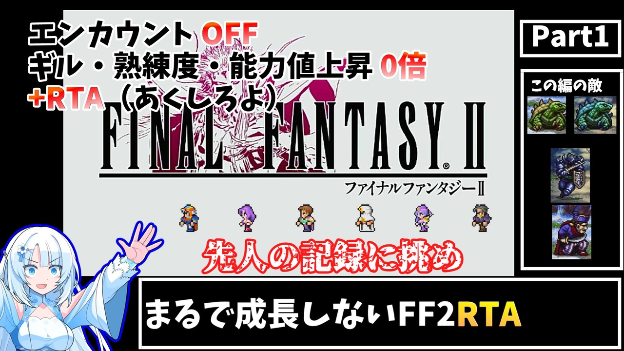 ピクセルリマスター版FF2(Switch版)を以下の条件でRTAしました。<br>はくさい氏の追走です。こちらを履修してからのご視聴をお勧め致します。→<a href="https://www.nicovideo.jp/series/459507" target="_blank" rel="noopener">series/459507</a><br><br>・ブースト機能をクリアまで下記で固定する<br> ・エンカウント:OFF<br> ・獲得ギル:0倍<br> ・武器熟練度アップ:0倍<br> ・魔法熟練度アップ:0倍<br> ・能力値アップ:0倍<br> ・HPアップ補正:OFF<br>・そのうえであくする<br>・道具・魔法・行動等は何を使ってもよい<br>・計測区間は名前決定時からラスボス撃破まで<br>・苦行はしない<br><br>並行しているFF2アイテム完全縛りも宜しくお願い致します。→<a href="https://www.nicovideo.jp/series/474323" target="_blank" rel="noopener">series/474323</a><br><br>VOICEVOX:WhiteCUL<br><br>参考サイト……<br>ファイナルファンタジー用語辞典:<a href="https://wikiwiki.jp/ffdic" target="_blank" rel="noopener nofollow">https://wikiwiki.jp/ffdic</a><br>GCGX(ゲーム攻略・解析&ホームページ作成):<a href="https://gcgx.games/" target="_blank" rel="noopener nofollow">https://gcgx.games/</a><br>FF2よ永遠なれ:<a href="https://surume5.han-be.com/Home/FF2/index.htm" target="_blank" rel="noopener nofollow">https://surume5.han-be.com/Home/FF2/index.htm</a><br>Gamer Corner Guides:<a href="https://guides.gamercorner.net/" target="_blank" rel="noopener nofollow">https://guides.gamercorner.net/</a><br>はたぼーの部屋:<a href="https://hboh2511.web.fc2.com/" target="_blank" rel="noopener nofollow">https://hboh2511.web.fc2.com/</a><br>cheapなゲーム攻略情報:<a href="http://www.ric.hi-ho.ne.jp/cheap_restaurant/GAME/" target="_blank" rel="noopener nofollow">http://www.ric.hi-ho.ne.jp/cheap_restaurant/GAME/</a><br>まるで成長しないFF2_RTA エンカOFF・ギル/熟練度/能力値0倍縛り:<a href="https://www.nicovideo.jp/series/459507" target="_blank" rel="noopener">series/459507</a><br><br>Part2→<a href="https://www.nicovideo.jp/watch/sm43876298" class="watch">sm43876298</a><br><br>© SQUARE ENIX<br>LOGO ILLUSTRATION:© YOSHITAKA AMANO<br>「記載されている会社名・製品名・システム名などは、各社の商標、または登録商標です。」<br><br><a target="_blank" href="https://qa.nicovideo.jp/faq/show/19424?site_domain=default" style="font-size: 13px;color: #657586; text-decoration: underline; line-height: 1.4">この動画は投稿者によって修正されました</a>