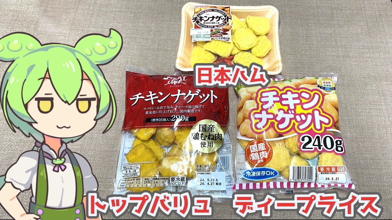 食品スーパーで見かけるチキンナゲットですが味は違うのでしょうか?<br><br><br>【参考】<br>ミートシェフチキンナゲット(トップバリュ)<br><a href="https://www.topvalu.net/items/detail/4549741384773/" target="_blank" rel="noopener nofollow">https://www.topvalu.net/items/detail/4549741384773/</a><br>D-PRICE(大黒天物産株式会社)<br><a href="https://www.e-dkt.co.jp/goods/" target="_blank" rel="noopener nofollow">https://www.e-dkt.co.jp/goods/</a><br>工場一覧(伊藤ハム米久ホールディングス)<br><a href="https://www.itoham-yonekyu-holdings.com/qc/factory_list_processedfoods/" target="_blank" rel="noopener nofollow">https://www.itoham-yonekyu-holdings.com/qc/factory_list_processedfoods/</a><br>チキンナゲット ソース2本付き(日本ハム)<br>※紹介した商品とは入り数や形態が違うようです<br><a href="https://www.nipponham.co.jp/products/processed_foods/chicken/2201/" target="_blank" rel="noopener nofollow">https://www.nipponham.co.jp/products/processed_foods/chicken/2201/</a><br>チキンマックナゲットの誕生のヒントは天ぷら!?(マクドナルド)<br><a href="https://www.mcdonalds.co.jp/campaign/thankyou50th/history/funburger/chickenmacnuggets/" target="_blank" rel="noopener nofollow">https://www.mcdonalds.co.jp/campaign/thankyou50th/history/funburger/chickenmacnuggets/</a><br>チキンマックナゲットの形は“4種類”に決まっている!? <br>そのワケをマクドナルドに聞いてみた 2019.09.19(FNNプライムオンライン)<br><a href="https://www.fnn.jp/articles/-/14213" target="_blank" rel="noopener nofollow">https://www.fnn.jp/articles/-/14213</a><br><br>【使用した素材】(※敬称略)<br>(合成音声)VOICEVOX/ずんだもん/四国めたん<br><a href="https://voicevox.hiroshiba.jp/" target="_blank" rel="noopener nofollow">https://voicevox.hiroshiba.jp/</a><br>(立ち絵)坂本アヒル<br><a href="https://seiga.nicovideo.jp/seiga/im10788496" target="_blank" rel="noopener">im10788496</a>/<a href="https://seiga.nicovideo.jp/seiga/im10791276" target="_blank" rel="noopener">im10791276</a><br>(楽曲)甘茶の音楽工房/「楽しい麦畑」「フルーツパフェ」「お城の舞踏会」<br><a href="https://amachamusic.chagasi.com/" target="_blank" rel="noopener nofollow">https://amachamusic.chagasi.com/</a><br>(素材)欽ちゃんの仮装大賞パネル 再現アプリ<br><a href="https://kinchan.toriiico.com/" target="_blank" rel="noopener nofollow">https://kinchan.toriiico.com/</a>
